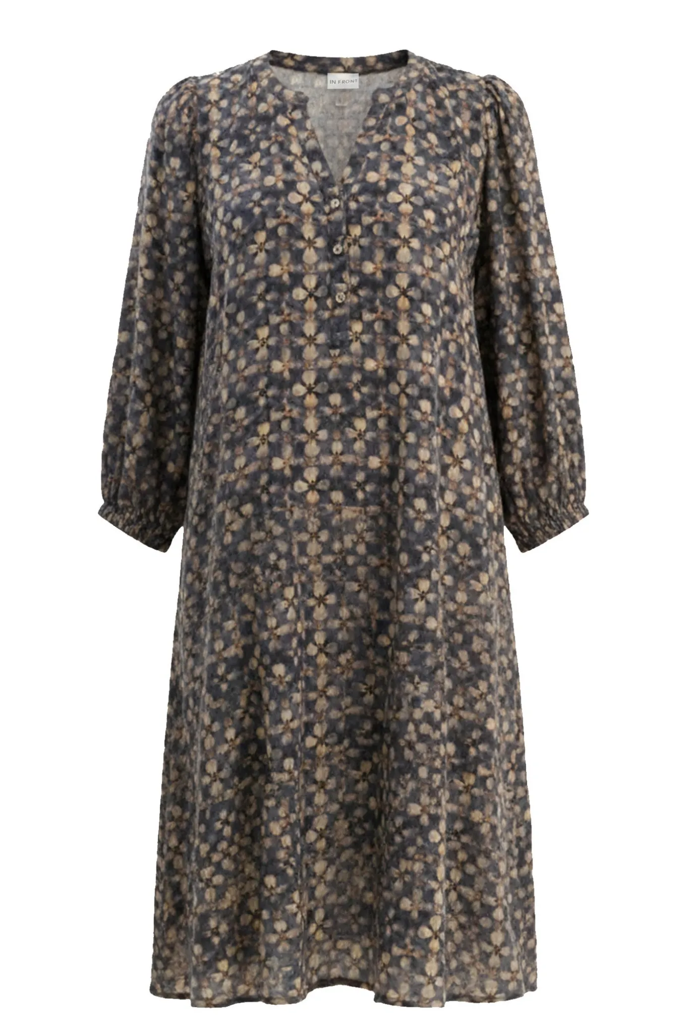 Denne smukke blå kjole fra IN FRONT er fremstillet af 80% viskose og 20% nylon, hvilket giver den en let og behagelig pasform. Perfekt til enhver lejlighed.