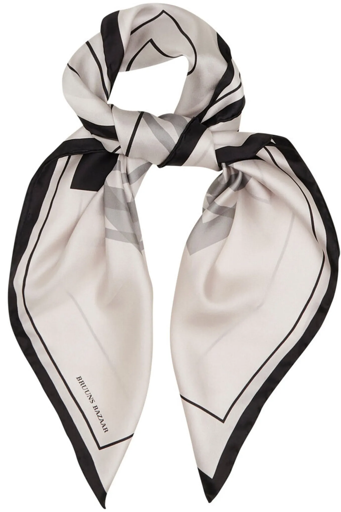 - OBS! Fjernlager. Levering kan blive forlænget med 2-3 dage, hvis varen ikke findes i vores butik lige nu.Smukt silke tørklæde fra Bruuns Bazaar med et flot grafisk print.