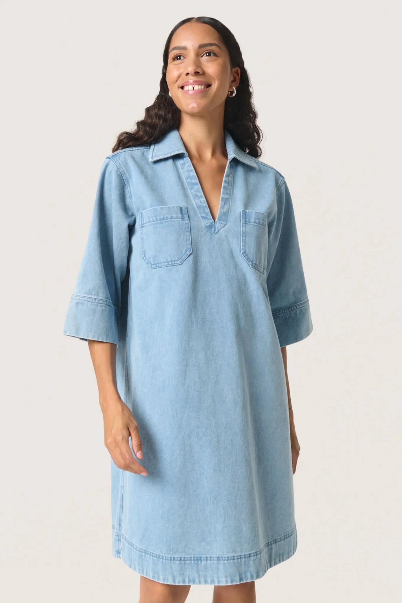OBS! Fjernlager. Levering kan blive forlænget med 2-3 dage, hvis varen ikke findes i vores butik lige nu.Cool skjortekjole fra Soaked In Luxury med ¾ lange ærmer, v-udskæring med krave i halsen og smarte lommer på brystet.