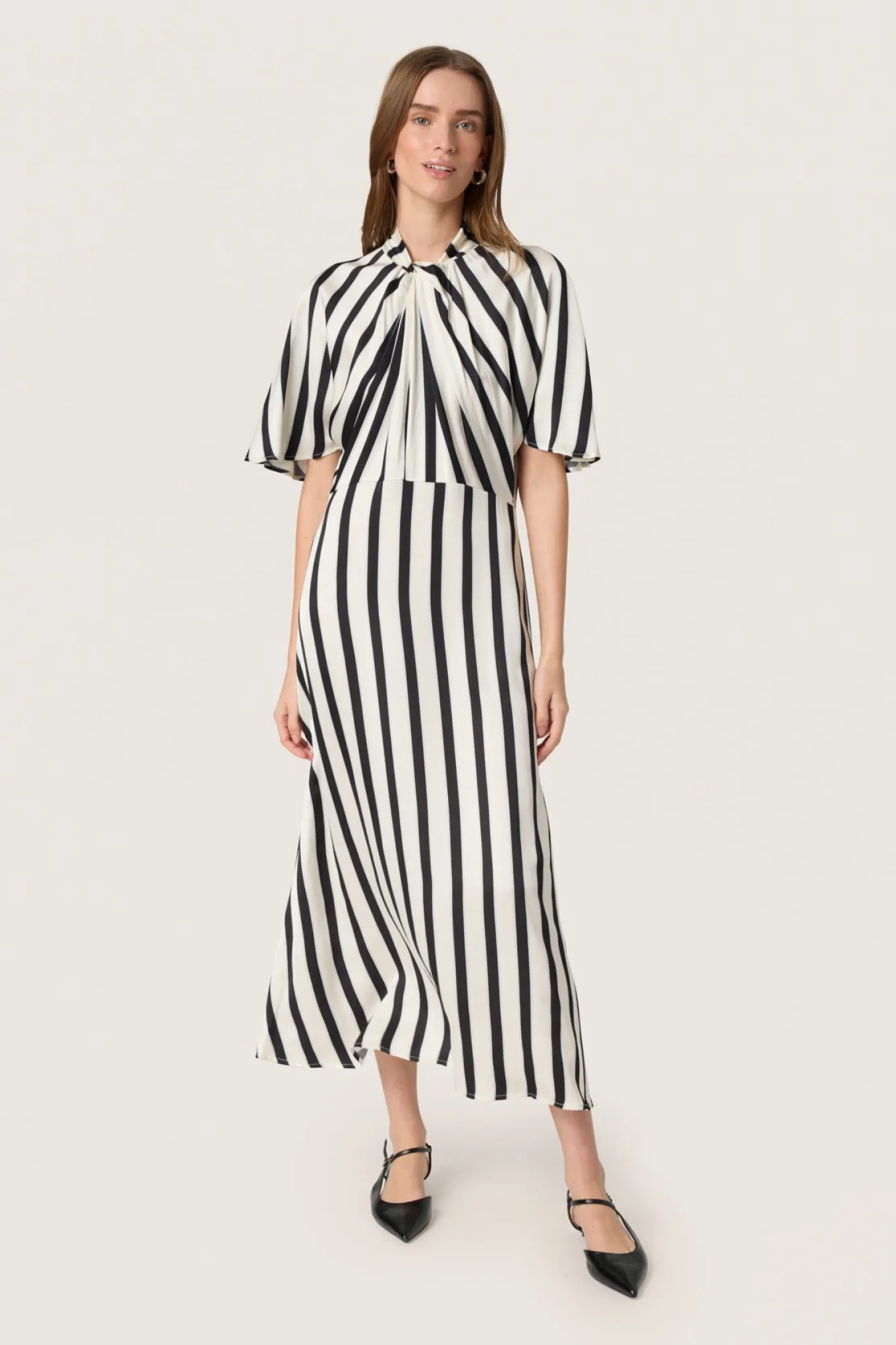 OBS! Fjernlager. Levering kan blive forlænget med 2-3 dage, hvis varen ikke findes i vores butik lige nu.Smuk kjole fra Soaked In Luxury med ½ lange ærmer, høj hals med en flot draperet effekt over brystet samt et feminint snit og klassiske striber .