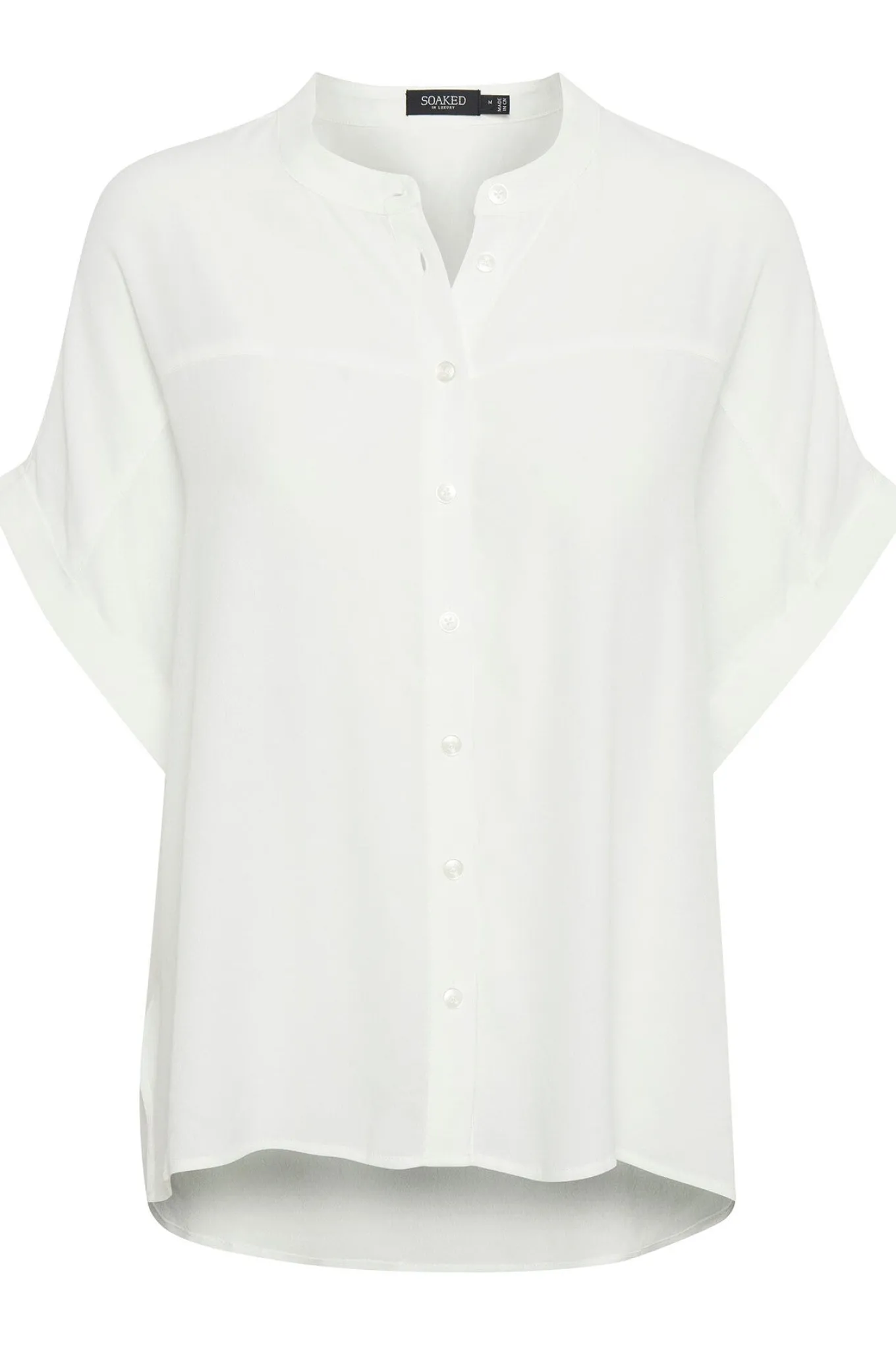 - OBS! Fjernlager. Levering kan blive forlænget med 1-2 dage, hvis varen ikke findes i vores butik lige nu.Smart bluse fra Soaked In Luxury med korte brede ærmer, kinakrave i halsen og en flot løs silhuet. Blusen lukkes med knapper langs fronten.