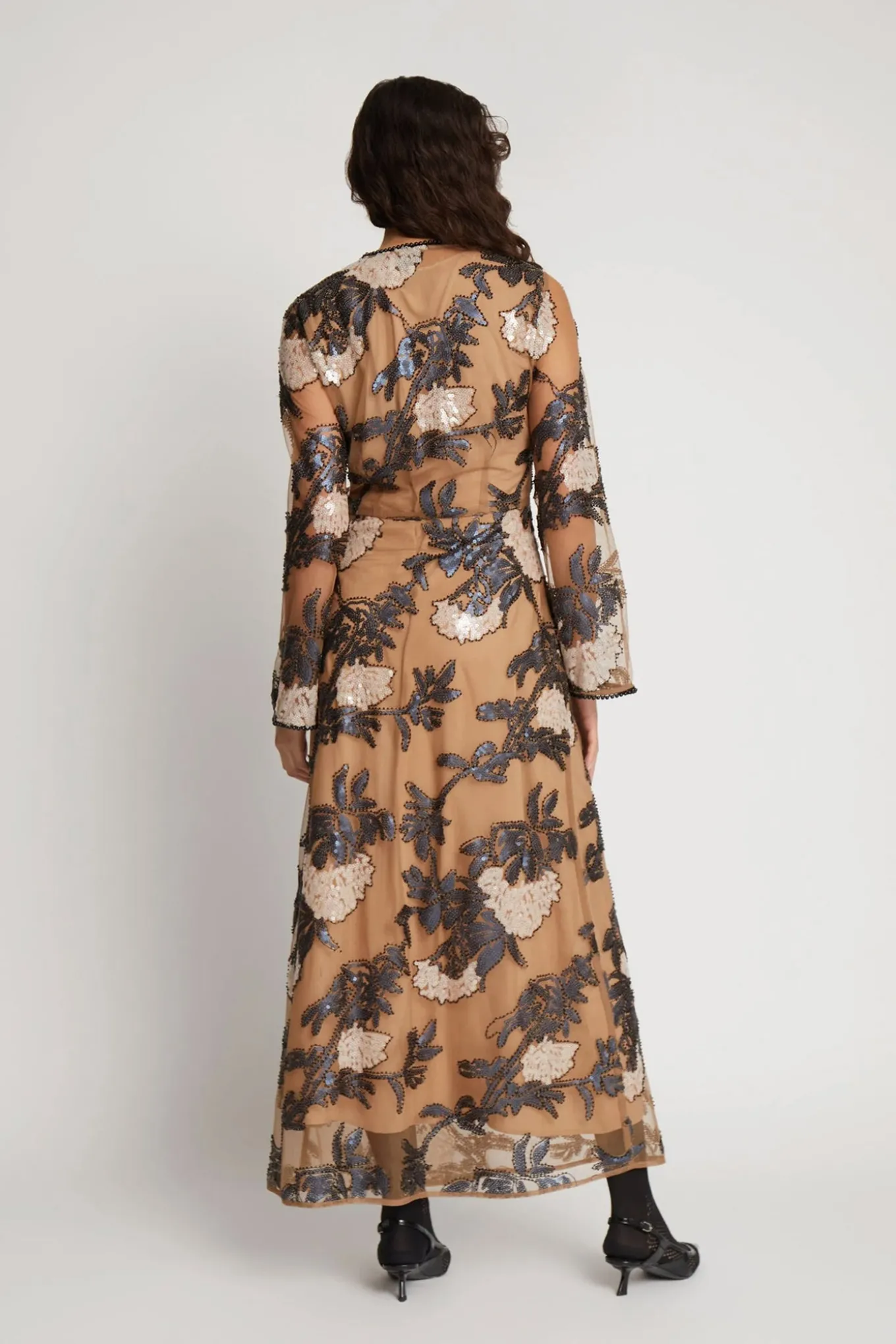 OBS! Fjernlager. Levering kan blive forlænget med 2-3 dage, hvis varen ikke findes i vores butik lige nu.En smuk kjole fra Munthe med et all-over perle og paillet blomster broderi. Kjolen har elegante sorte perler langs kanterne af den smukke v-hals, samt ved afslutningen af ærmerne. Denne kjole er designet med en aftagelig underkjole for at skabe flere styling muligheder.