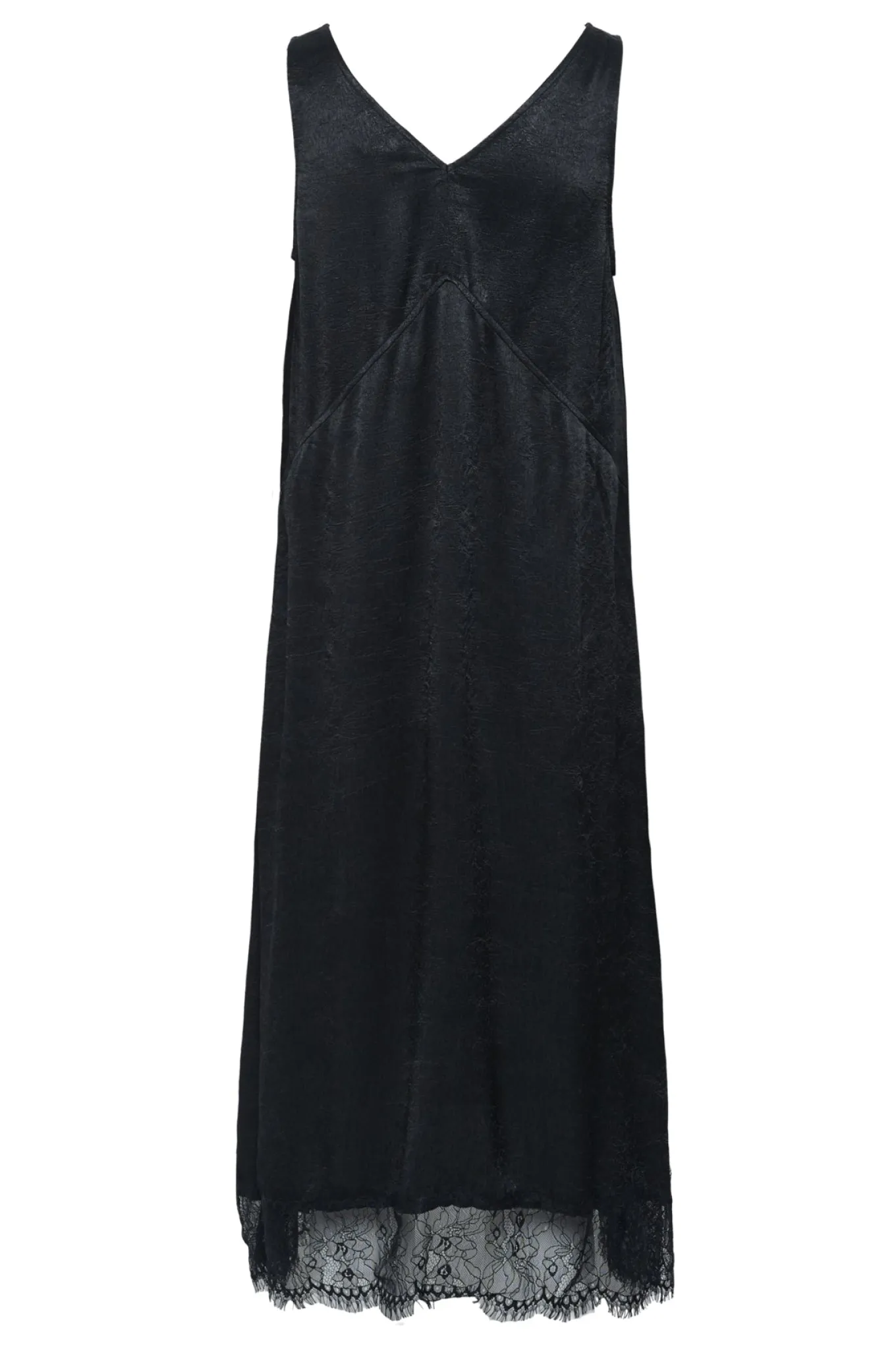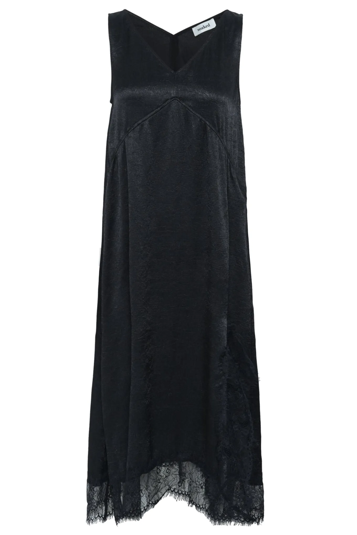 OBS! Fjernlager. Levering kan blive forlænget med 2-3 dage, hvis varen ikke findes i vores butik lige nu.Elegant kjole fra Soaked In Luxury med v-udskæring i halsen, en smuk blank kvalitet og super fine blondekanter i bunden.Kjolen har også et afslappet snit og slids i siden.