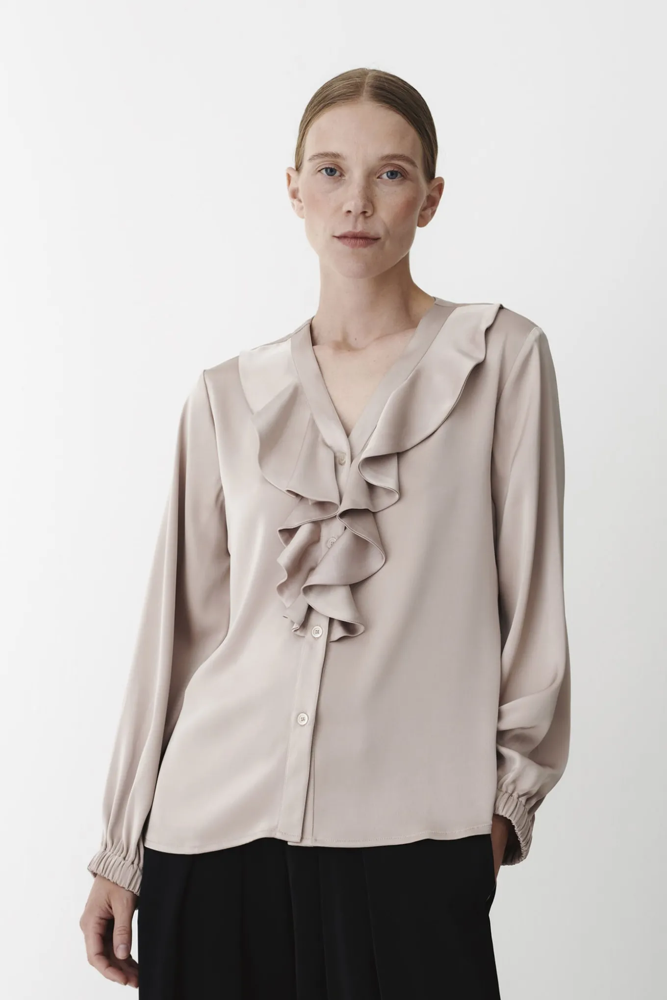 OBS! Fjernlager. Levering kan blive forlænget med 2-3 dage, hvis varen ikke findes i vores butik lige nu.Elegant bluse fra Karmamia med lange ærmer, v-udskæring i halsen og de smukkeste flæser over brystet.Blusen har også knaplukning langs fronten og den lækreste kvalitet.