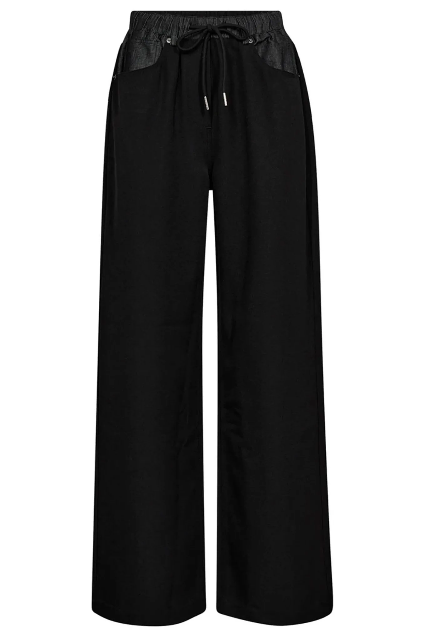 OBS! Fjernlager. Levering kan blive forlænget med 2-3 dage, hvis varen ikke findes i vores butik lige nu.Smarte bukser fra Haute L’Amitié med en bred elastikkant og bindesnor i taljen, vidde i benene og et cool udtryk.