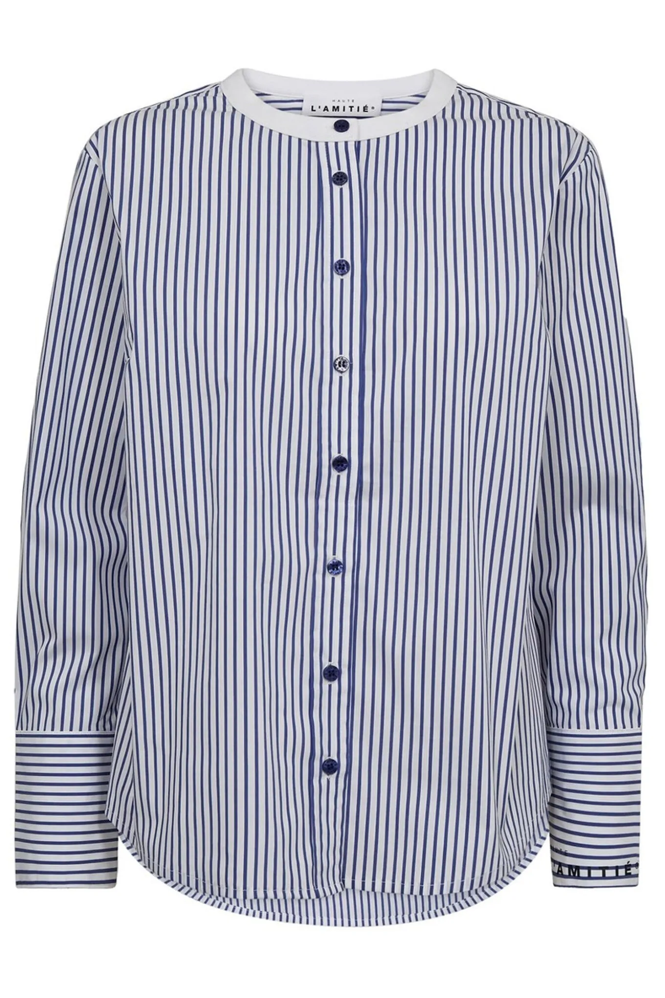 OBS! Fjernlager. Levering kan blive forlænget med 2-3 dage, hvis varen ikke findes i vores butik lige nu.Super fin skjortebluse fra Haute L’Amitié med lange ærmer, kinakrave i halsen og brede manchetter.Skjorten har også et klassisk stribet print og knaplukning langs fronten.