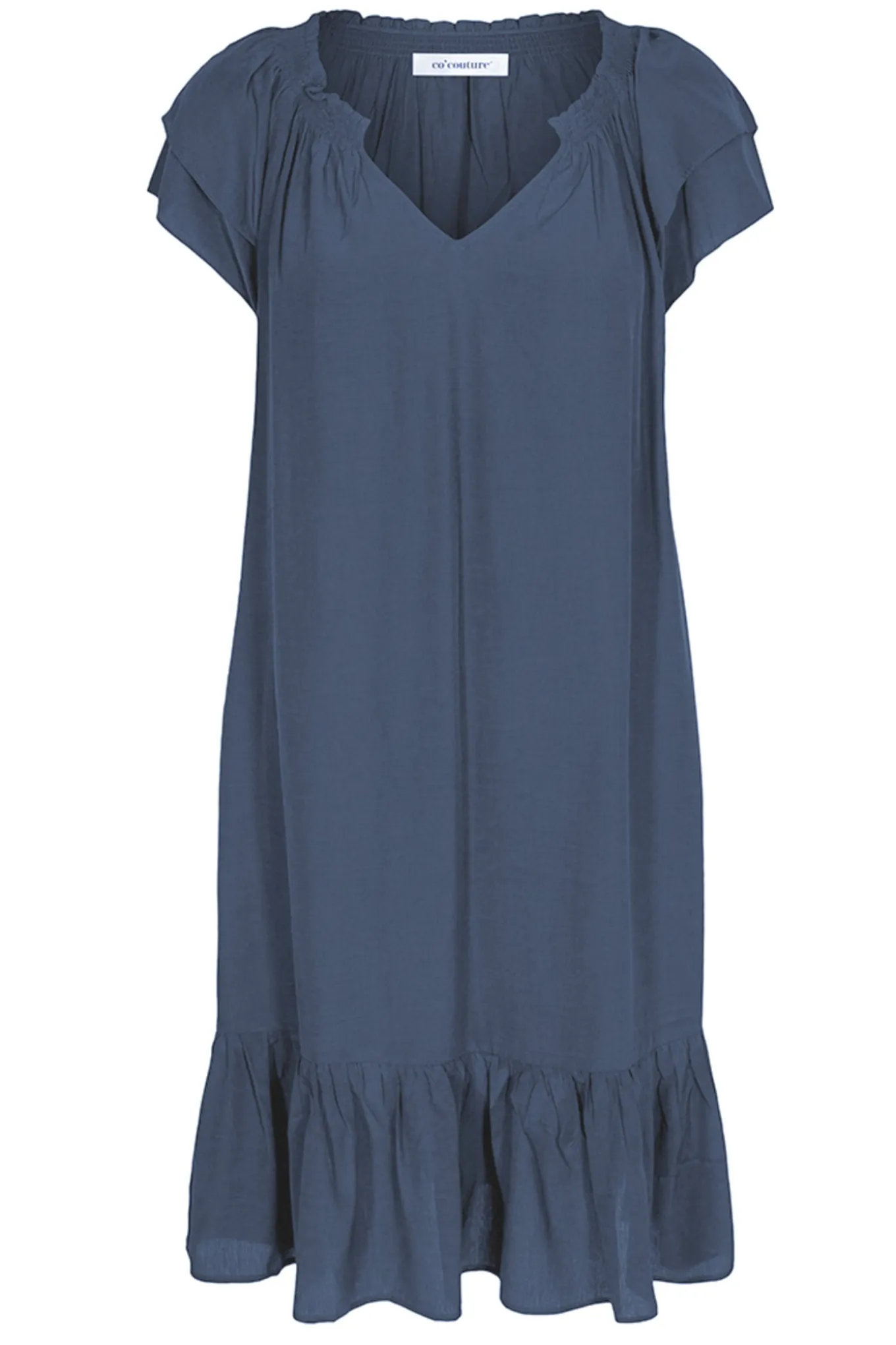 Co’couture’s klassiske Sunrise kjole med skønne korte ærmer, v-hals og flotte flæser i bunden af skørtet. Kjolen har også en behagelig afslappet silhuet og en lækker blød kvalitet.