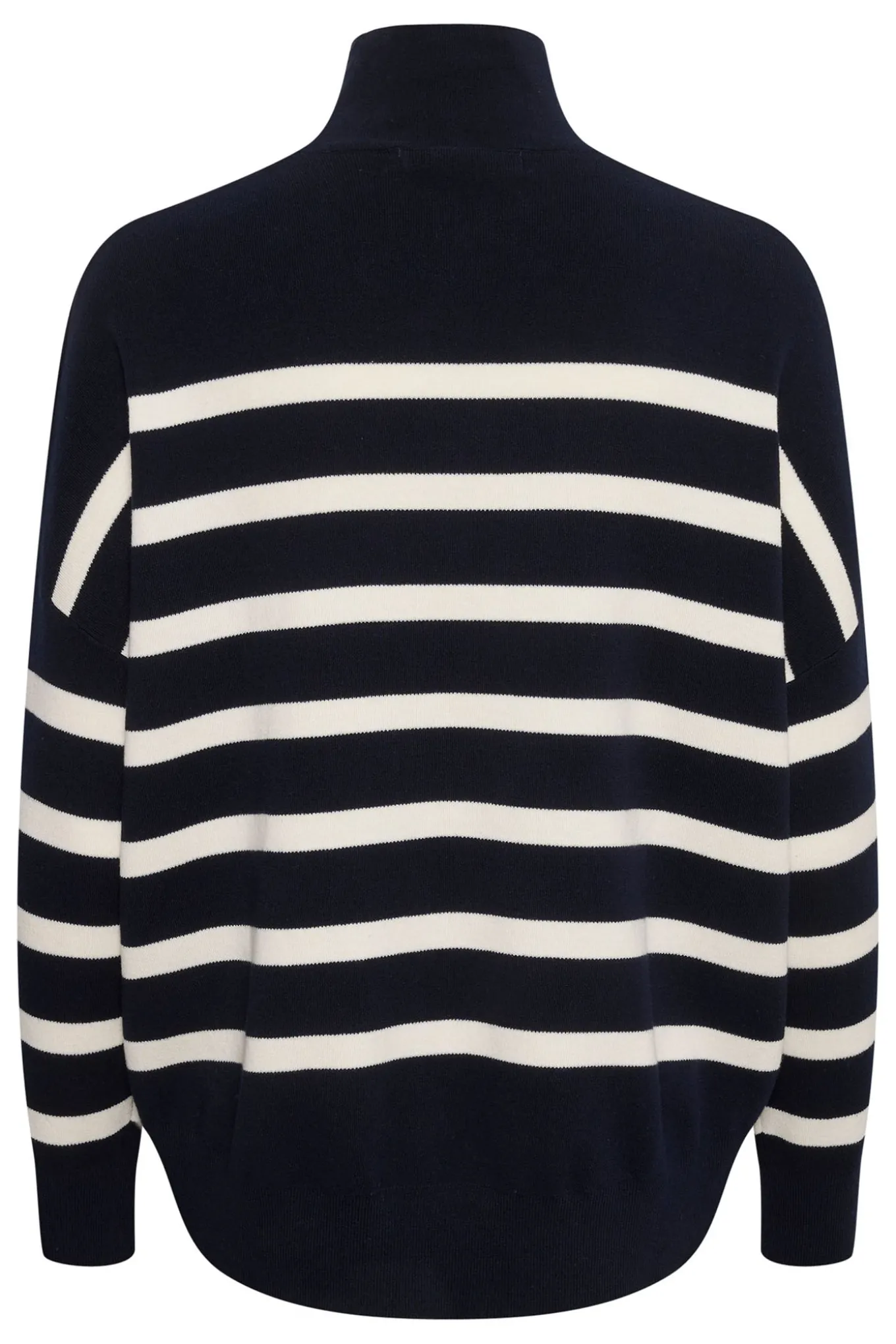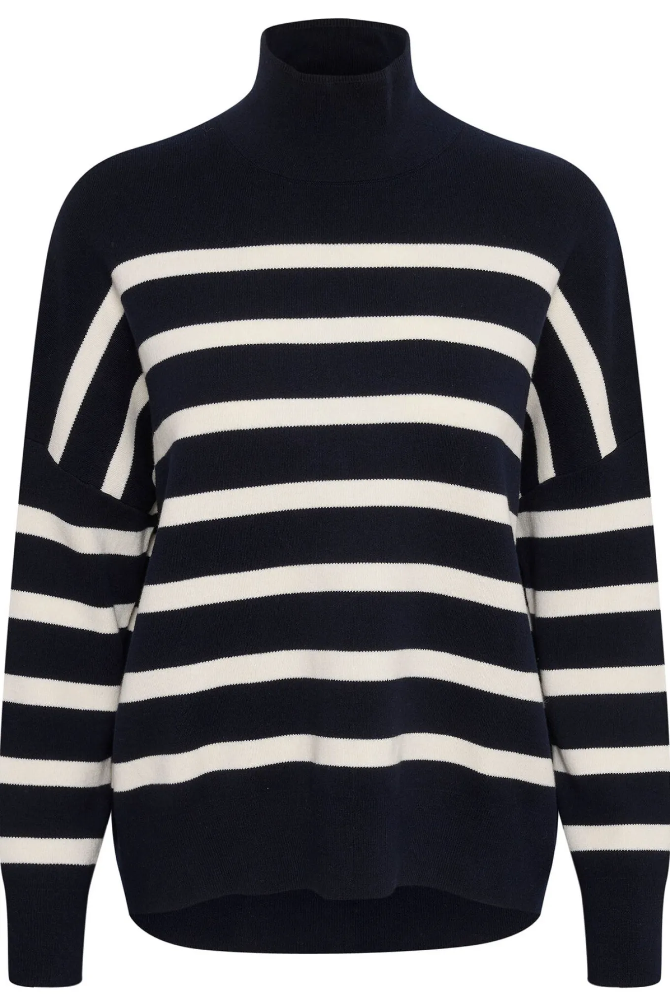 OBS! Fjernlager. Levering kan blive forlænget med 1-2 dage, hvis varen ikke findes i vores butik lige nu.Lækker strik fra InWear med lange ærmer og høj hals. Strikken har også en fantastisk dejlig kvalitet der falder smukt langs kroppen og et fint stribet mønster der står i flot kontrast til den neutrale baggrund.