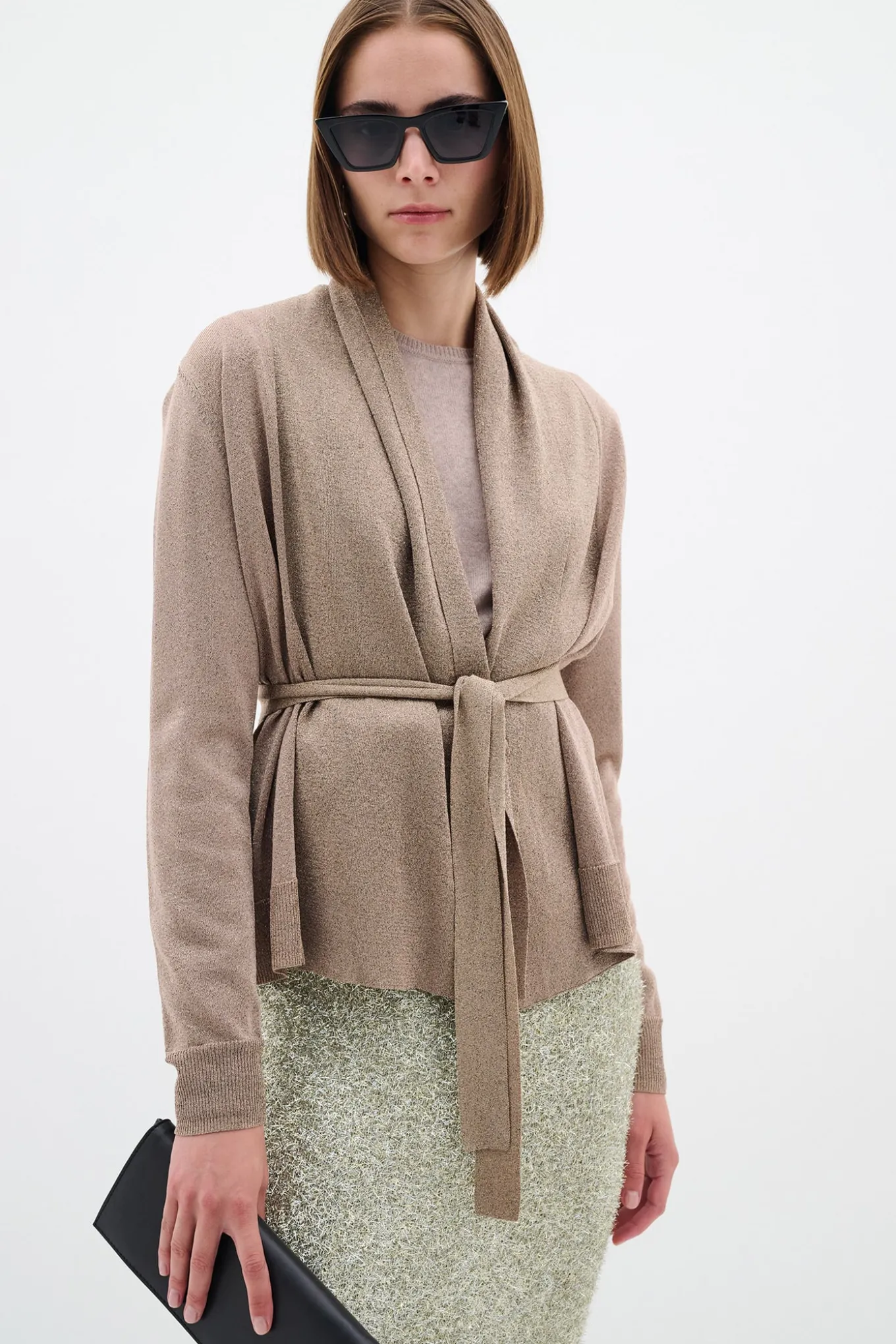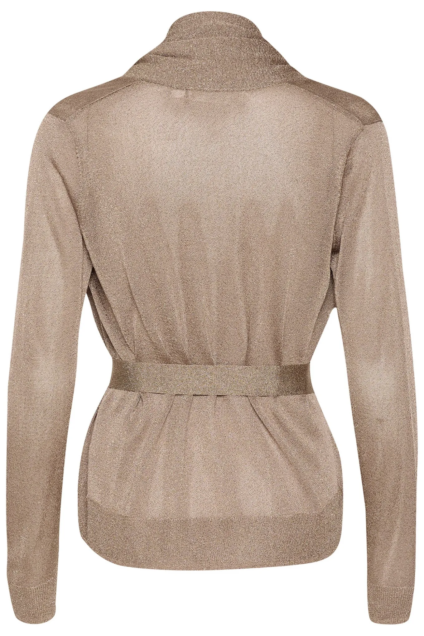 OBS! Fjernlager. Levering kan blive forlænget med 2-3 dage, hvis varen ikke findes i vores butik lige nu.Flot cardigan fra InWear med lange ærmer, bindebælte i taljen og en cropped længde. Cardiganen har også en skøn glimmerkvalitet.