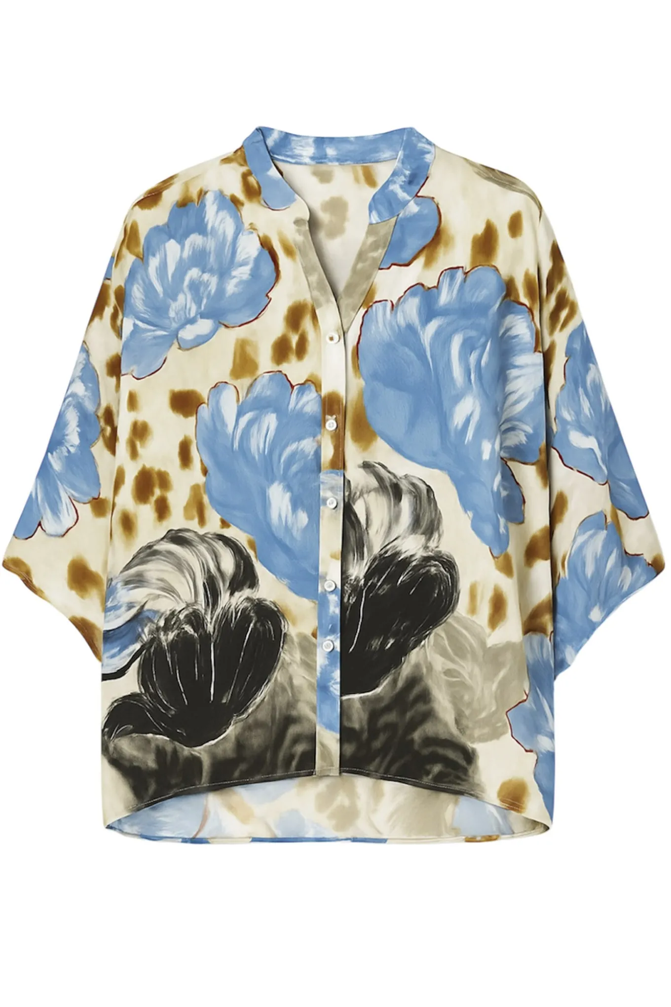 OBS! Fjernlager. Levering kan blive forlænget med 2-3 dage, hvis varen ikke findes i vores butik lige nu.Elegant skjorte fra 2-Biz med ¾ lange ærmer, rund hals med v-udskæring og smukke perleknapper langs fronten.