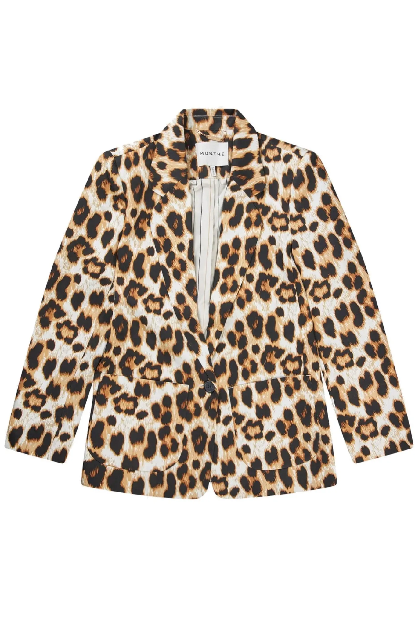 OBS! Fjernlager. Levering kan blive forlænget med 2-3 dage, hvis varen ikke findes i vores butik lige nu.Lækker blazer fra Munthe med et smukt all-over leo print, med elegante lommer og en enkelt knap lukning. Jakken er designet med et fint nålestribet for.