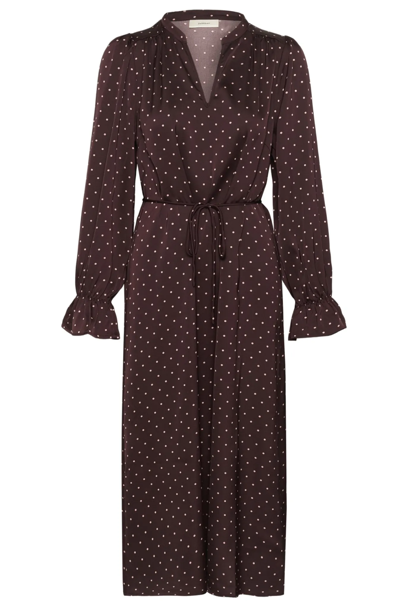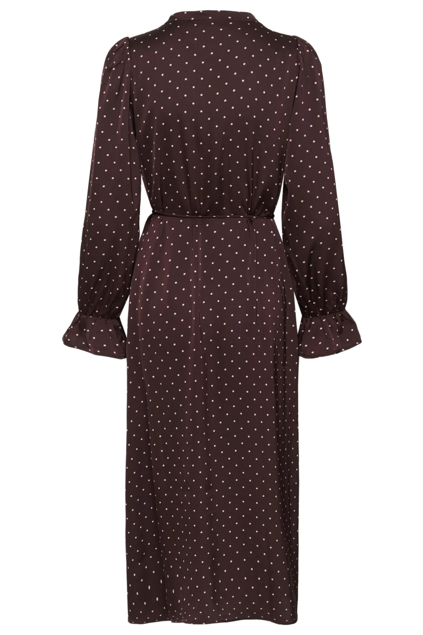 Oplev stilfuld elegance med denne Inwear kjole i en smuk brun bordeaux farve med små polkaprikker. Lavet af 100% polyester og perfekt til enhver lejlighed.