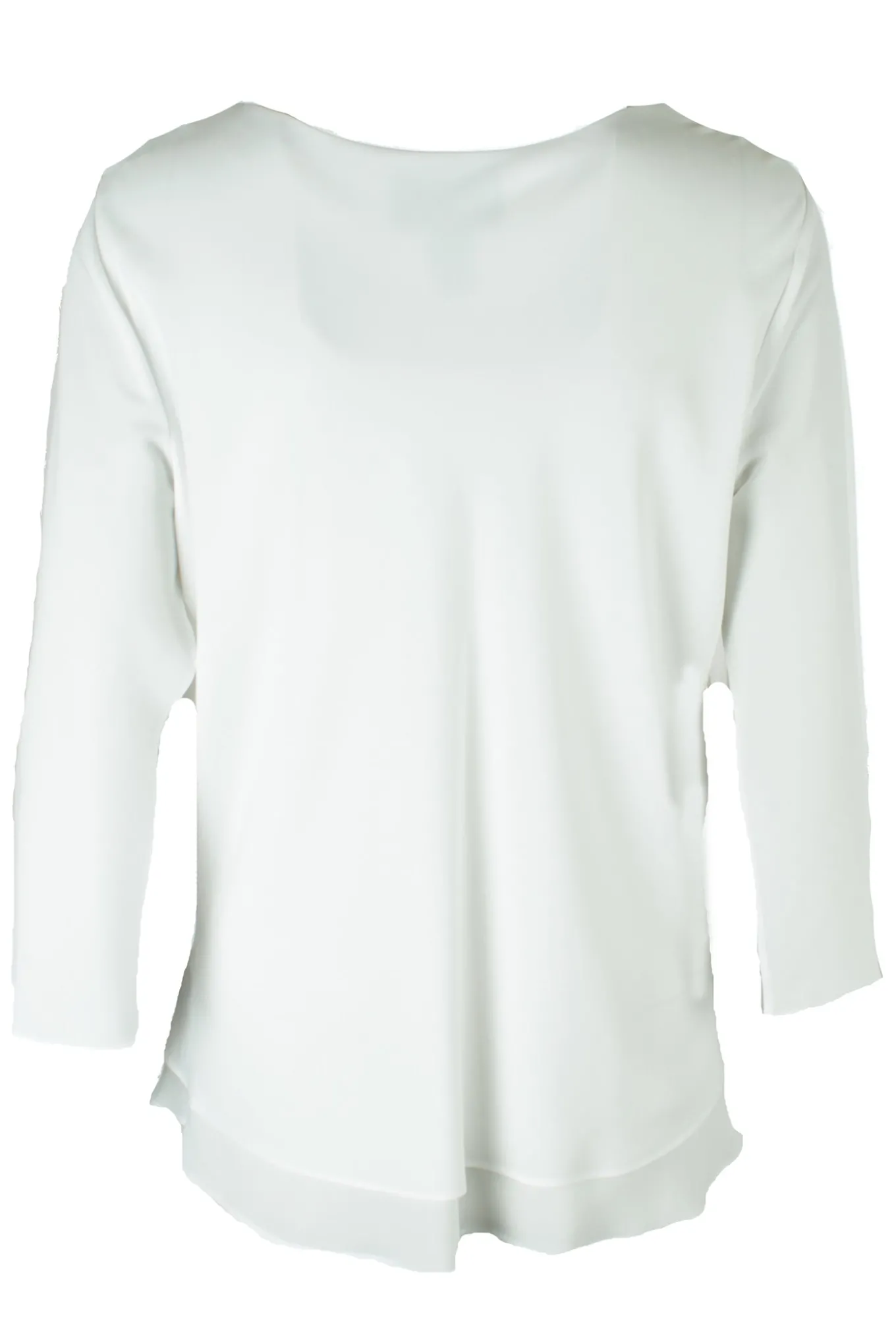 Denne elegante bluse har V-hals og 3/4 lange brede åbne arme. Stylen er let transparent og har dobbelt stof på front og bag.
