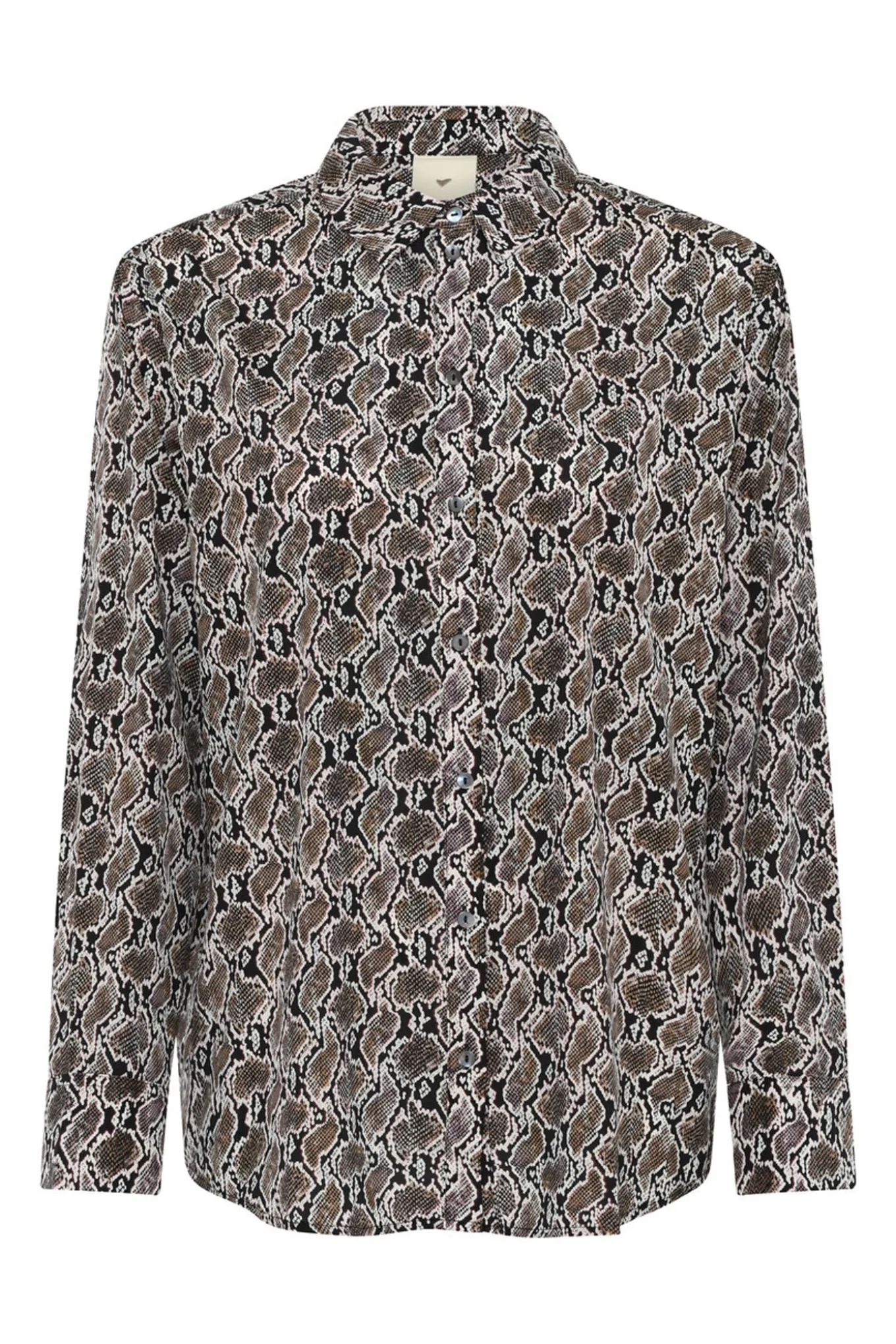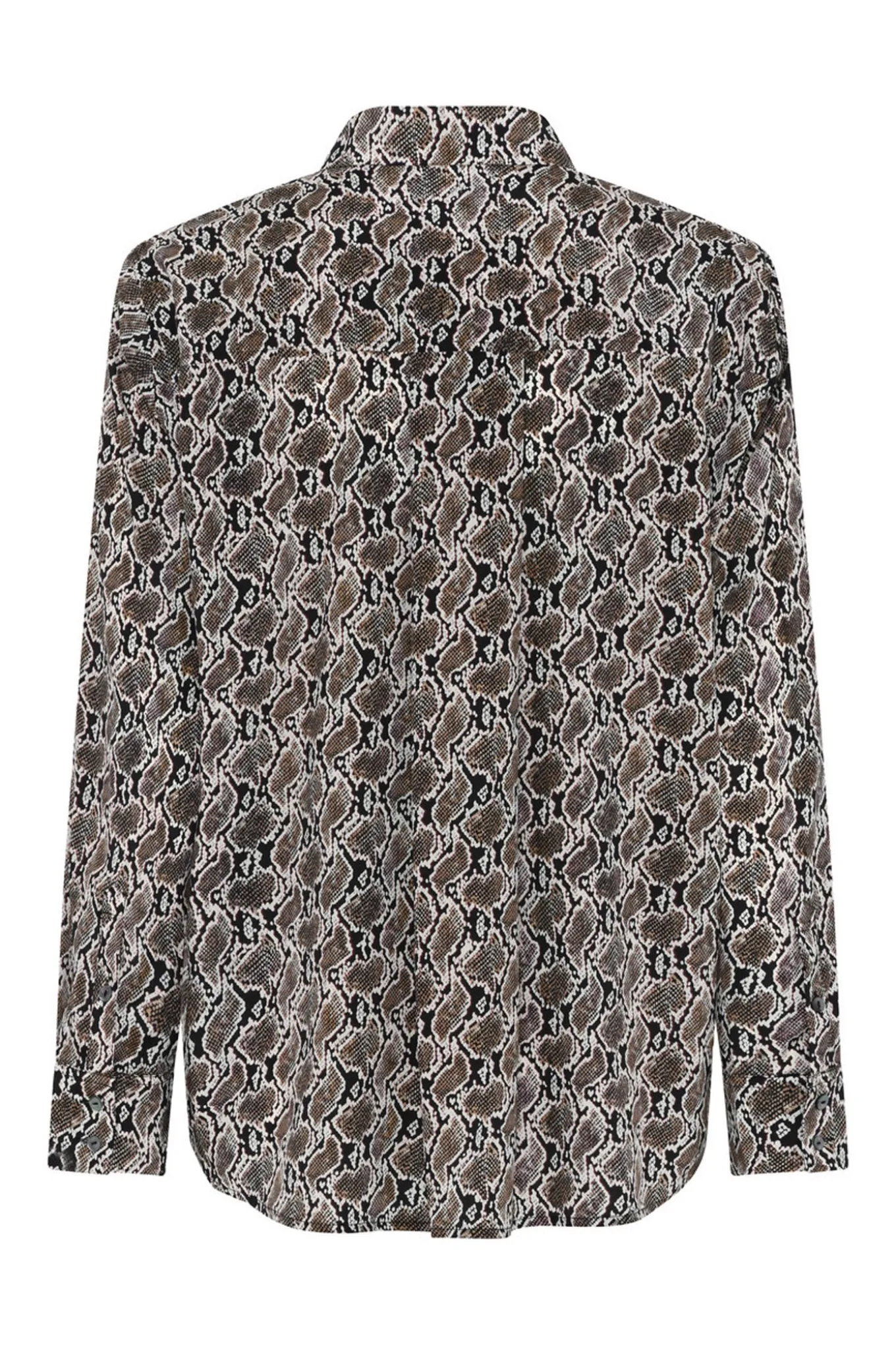 Løs skjorte med klassisk krave og skjult knaplukning. Printet tilføjer et grafisk udtryk og raffineret kant til den rene silhuet.