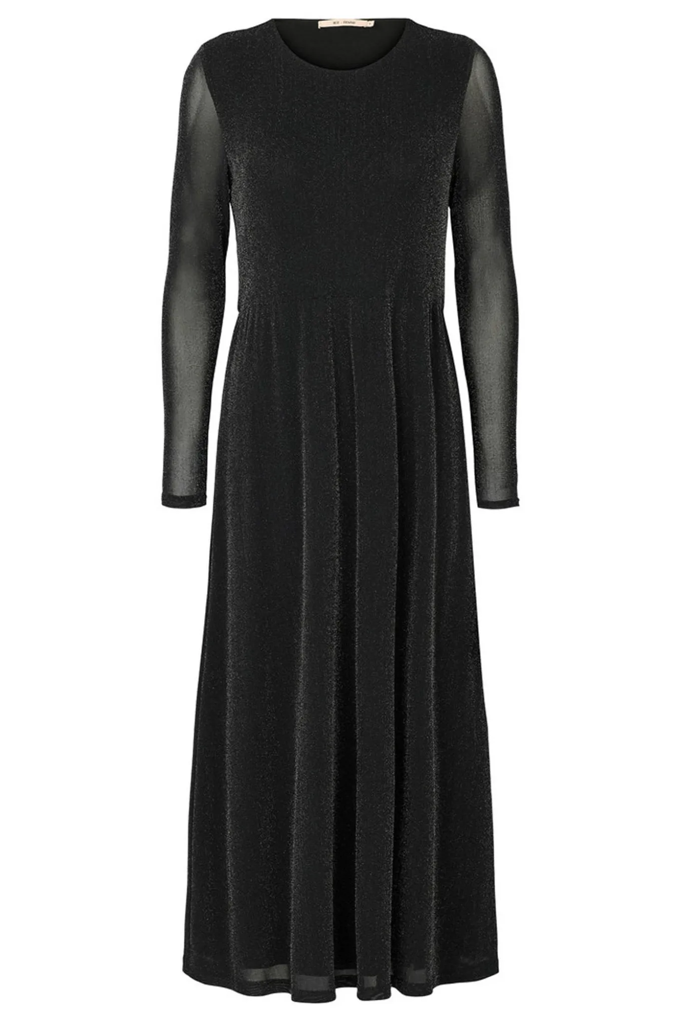 Elegant festkjole fra Rue de Femme med lange, let gennemsigtige ærmer og en rund halsudskæring. Det blanke materiale fanger lyset, mens den definerede talje med rynker skaber en feminin og flatterende silhuet.