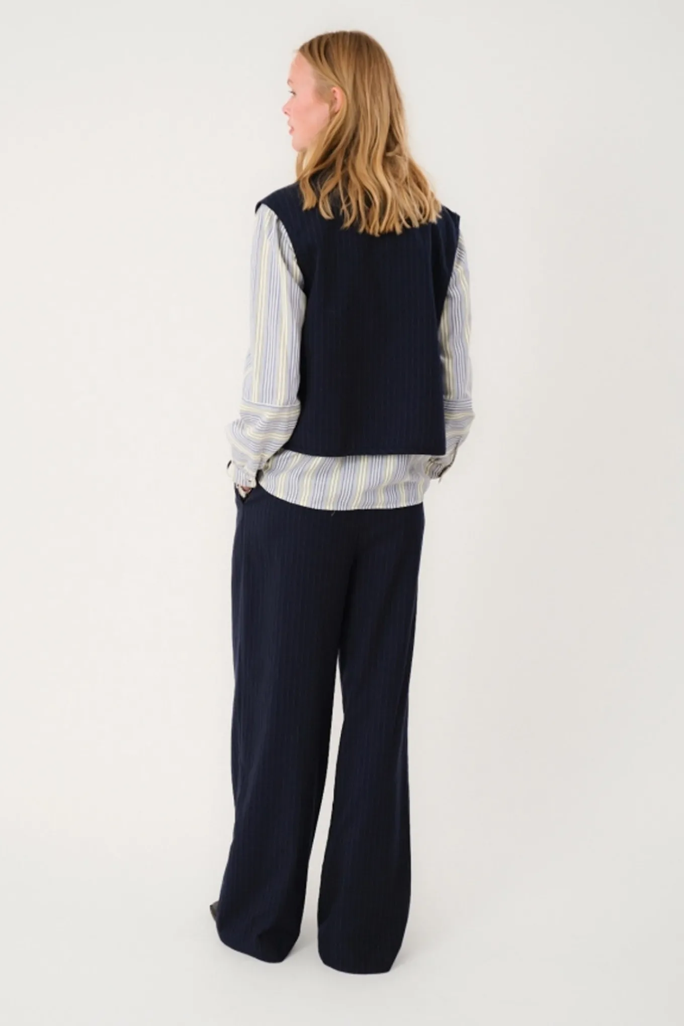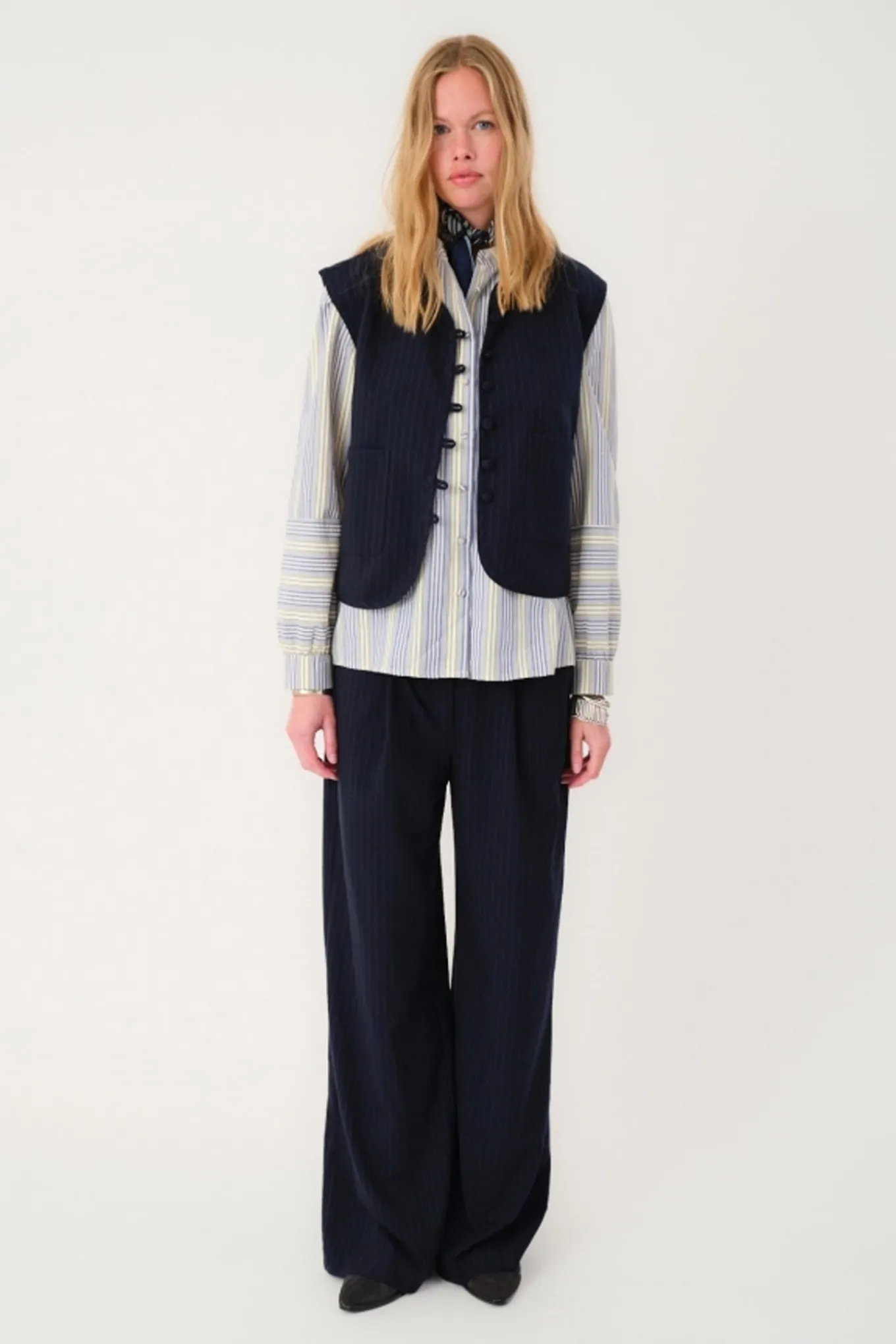 OBS! Fjernlager. Levering kan blive forlænget med 2-3 dage, hvis varen ikke findes i vores butik lige nu.Smart pinstripe vest fra Lollys Laundry med rund hals, små beklædte knapper og fine lommer på fronten.