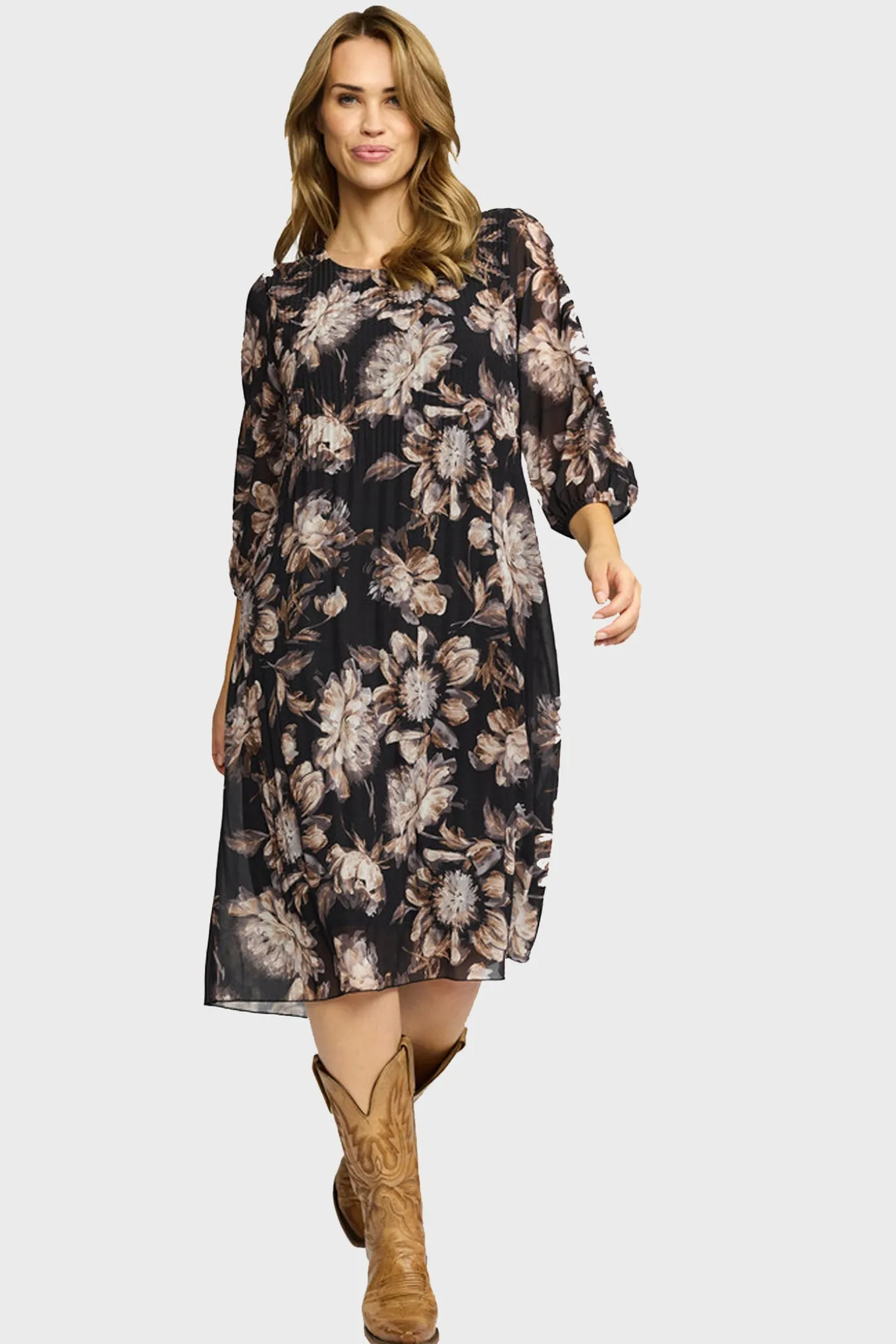 Få et elegant og feminint look med denne 2-BIZ kjole i farven GOLDEN FLOWER. Fremstillet af 100% polyester, er den perfekt til enhver lejlighed.