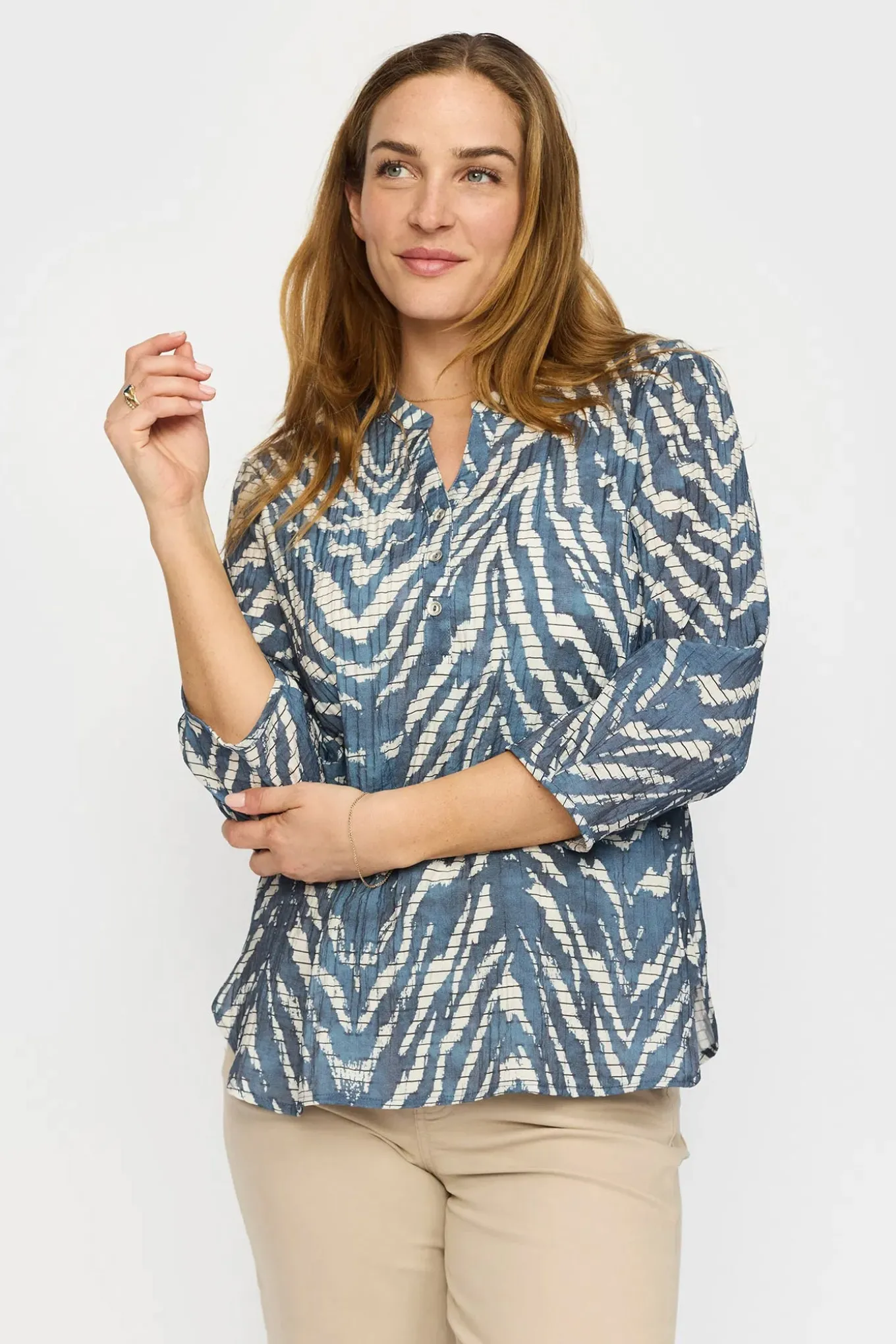 OBS! Fjernlager. Levering kan blive forlænget med 2-3 dage, hvis varen ikke findes i vores butik lige nu.Flot bluse fra 2-Biz med ¾ lange ærmer, rund hals med v-udskæring i halsen og et super fint print.