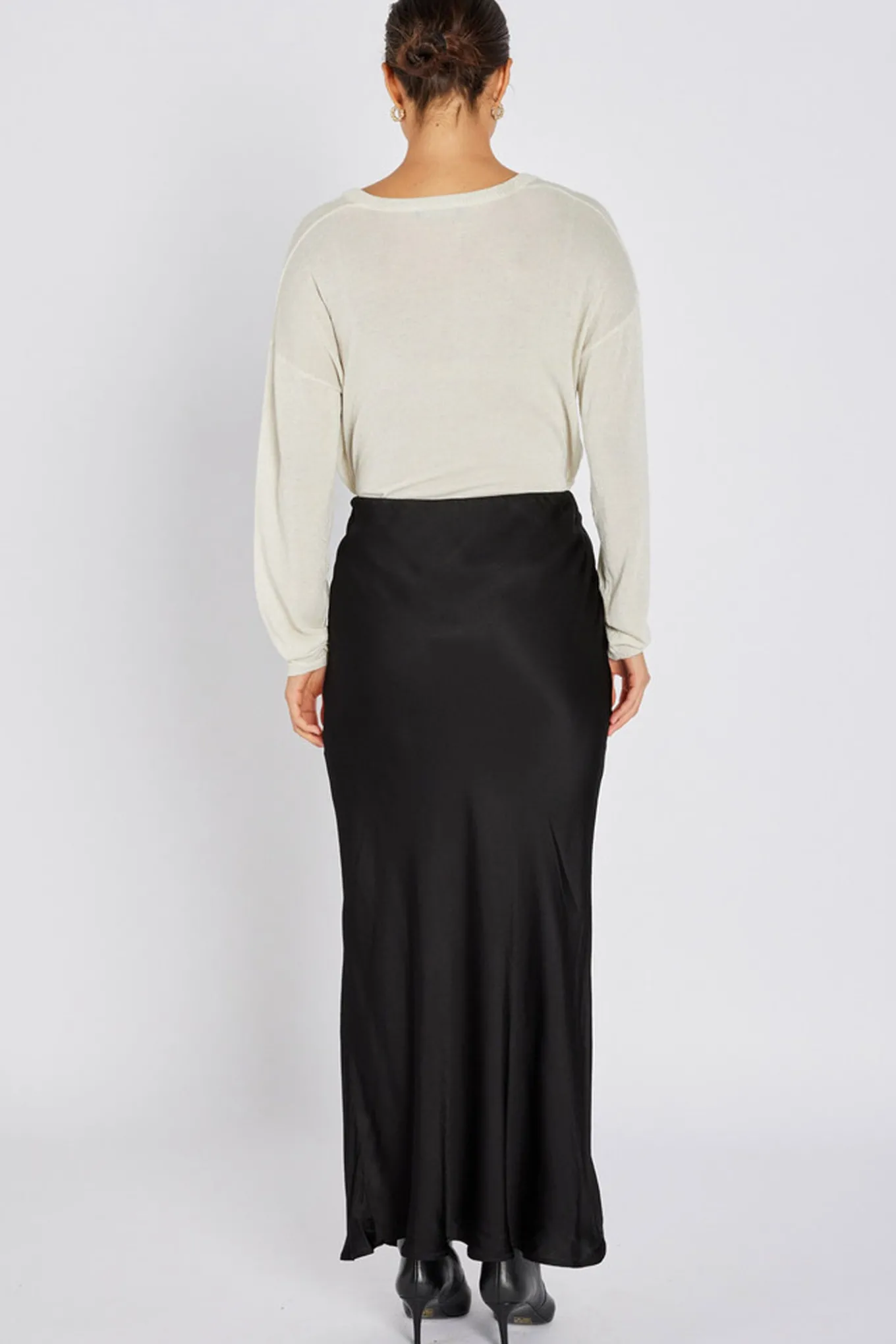 Elegant, lang satinnederdel med et rent, minimalistisk snit, der falder smukt og sofistikeret.