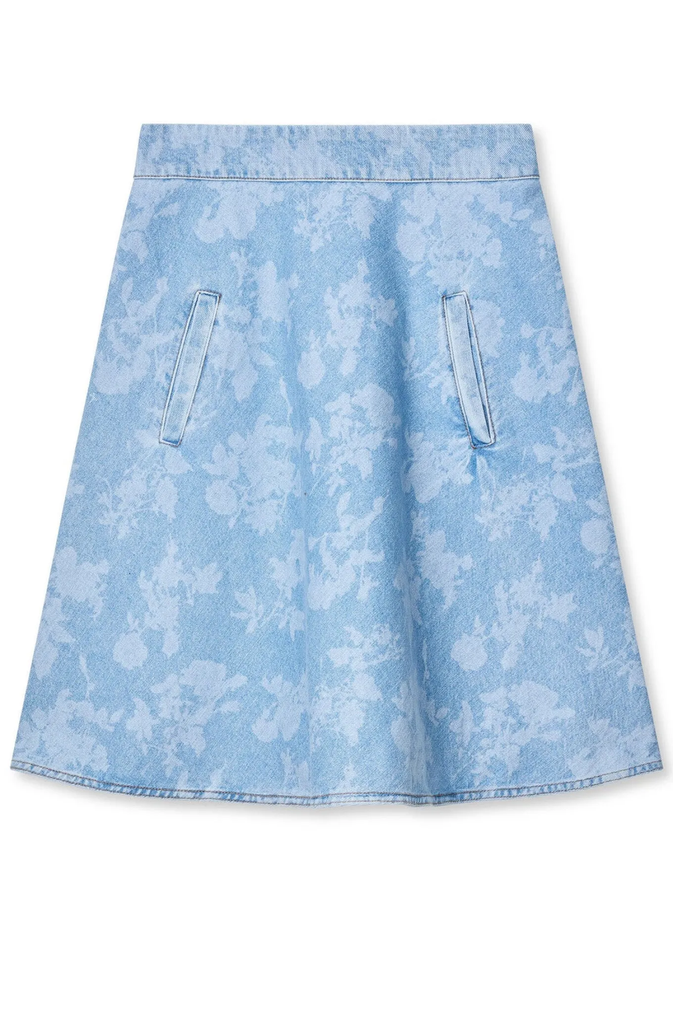 Knælang denim nederdel fra Mads Nørgaard med en bred kant i taljen og smarte lommer foran.