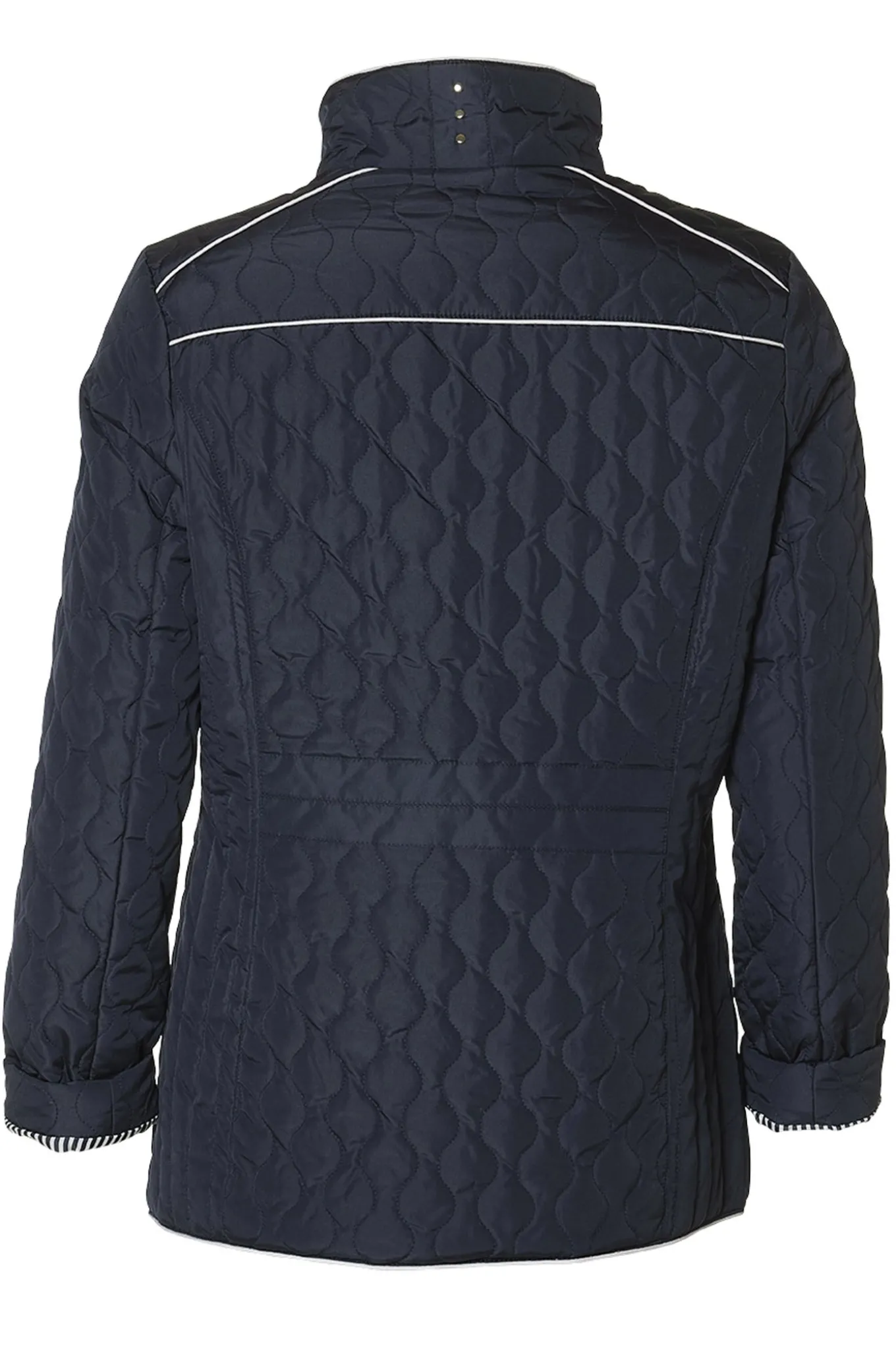 OBS! Fjernlager. Levering kan blive forlænget med 2-3 dage, hvis varen ikke findes i vores butik lige nu.Super flot quiltet jakke fra Danwear med lange ærmer, høj hals og et smart stribet foer.Jakken har også flotte kontrastfarvet kanter, skrå lynlåslommer og skjult lynlåslukning langs fronten bag et trykknappanel.