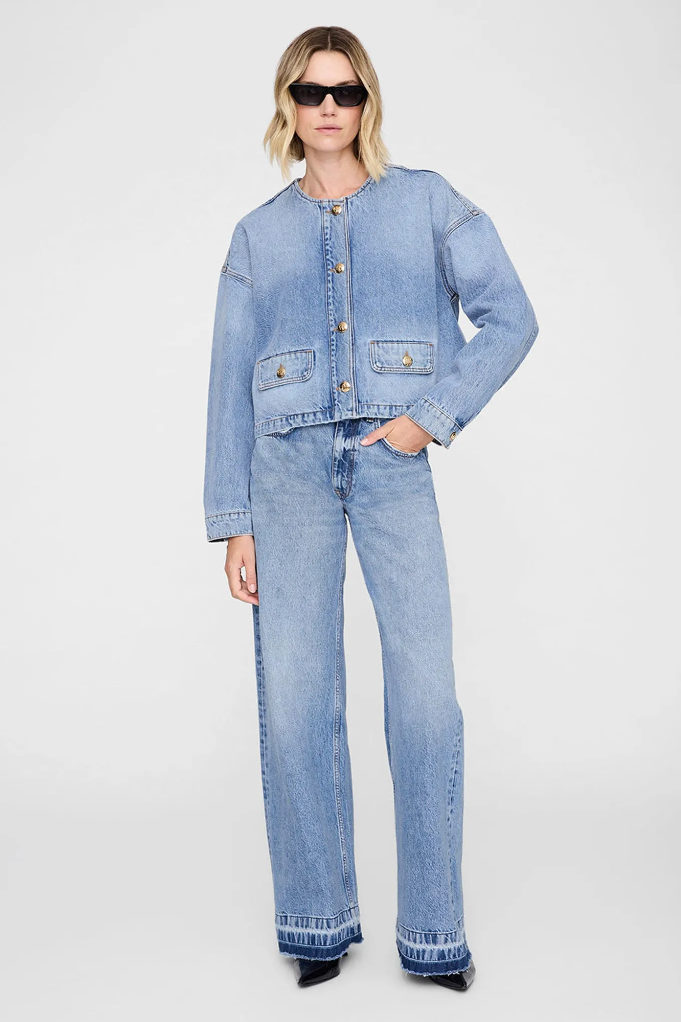 Omslut dig selv i blødhed med denne lette jakke fra ANINE BING. Den er lavet af 100% regenerativ bomuld og har en smuk lysblå farve. Perfekt til enhver sæson.