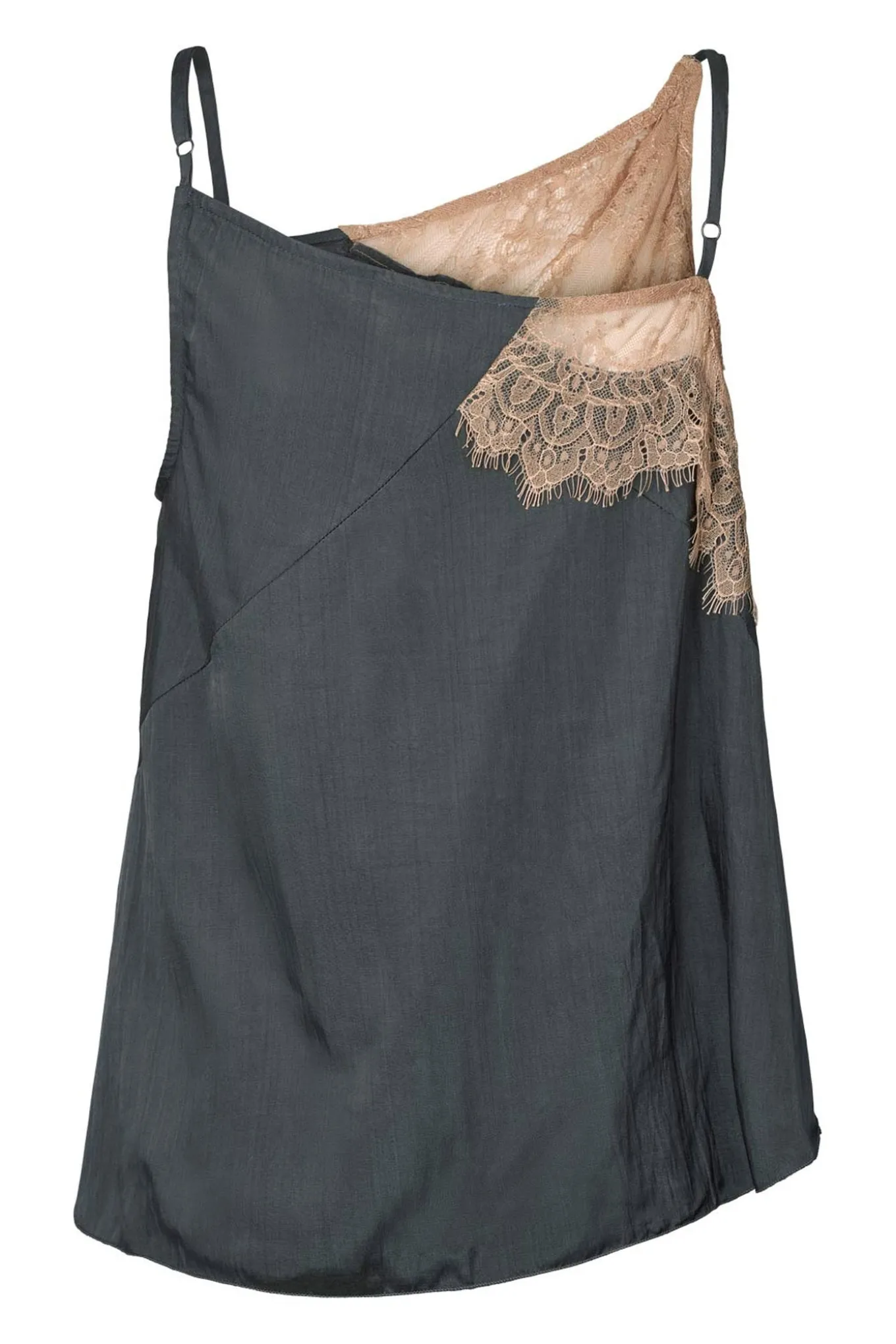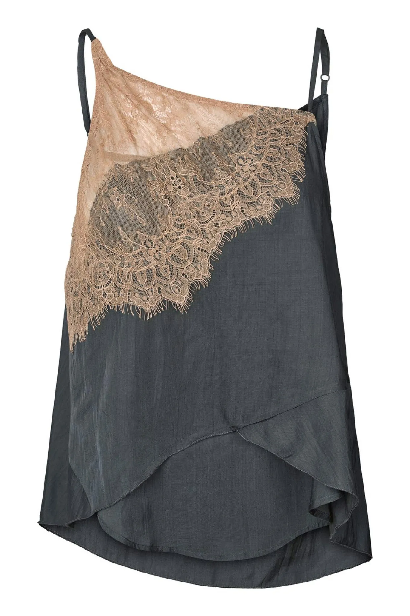 - OBS! Fjernlager. Levering kan blive forlænget med 2-3 dage, hvis varen ikke findes i vores butik lige nu.Elegant top fra Rabens Saloner med smalle justerbare skulderstropper og smukke blondedetaljer over brystet.