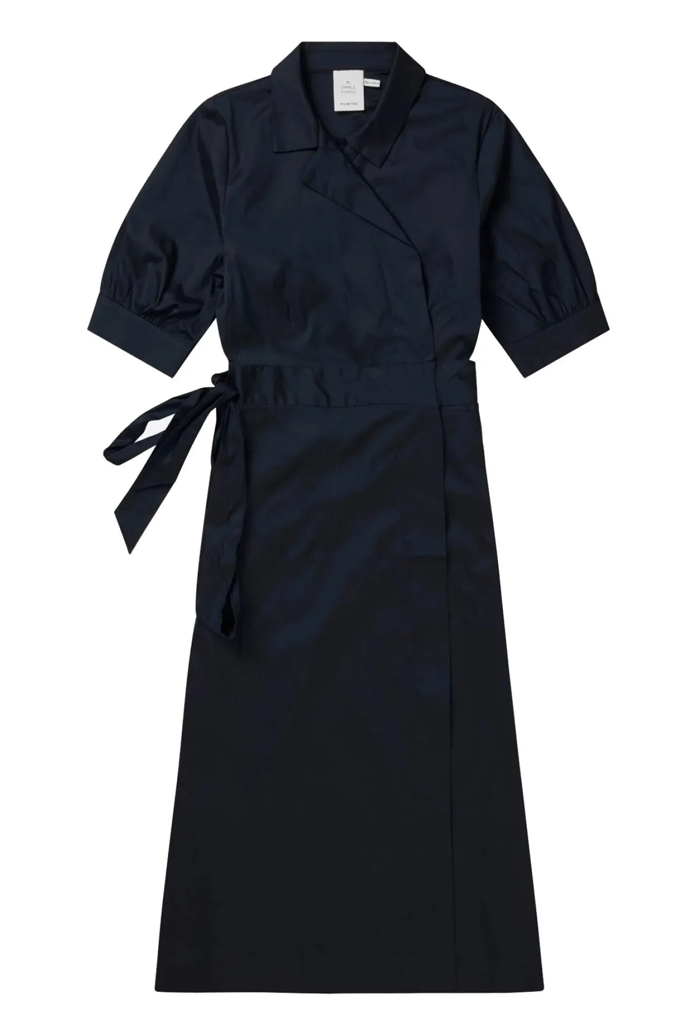 OBS! Fjernlager. Levering kan blive forlænget med 2-3 dage, hvis varen ikke findes i vores butik lige nu.Klassisk slå-om skjorte kjole fra Munthe, lavet i en økologisk bomulds blanding. Denne tætsiddende kjole har albue lange ærmer, med et lille puf og et elegant bindebånd i taljen.