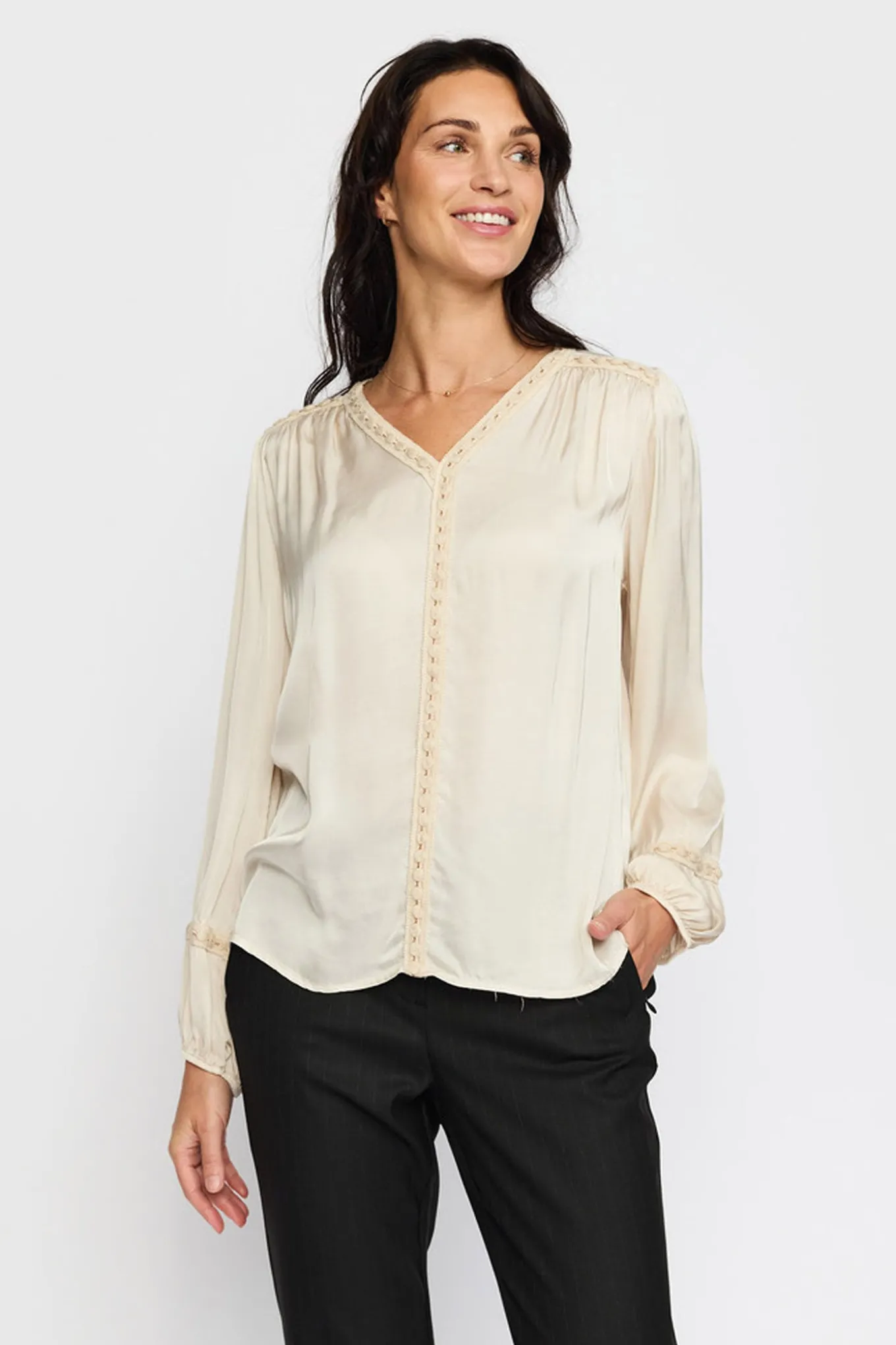 Elegant bluse fra 2-Biz med lange ærmer, v-udskæring i halsen og smukke detaljer.