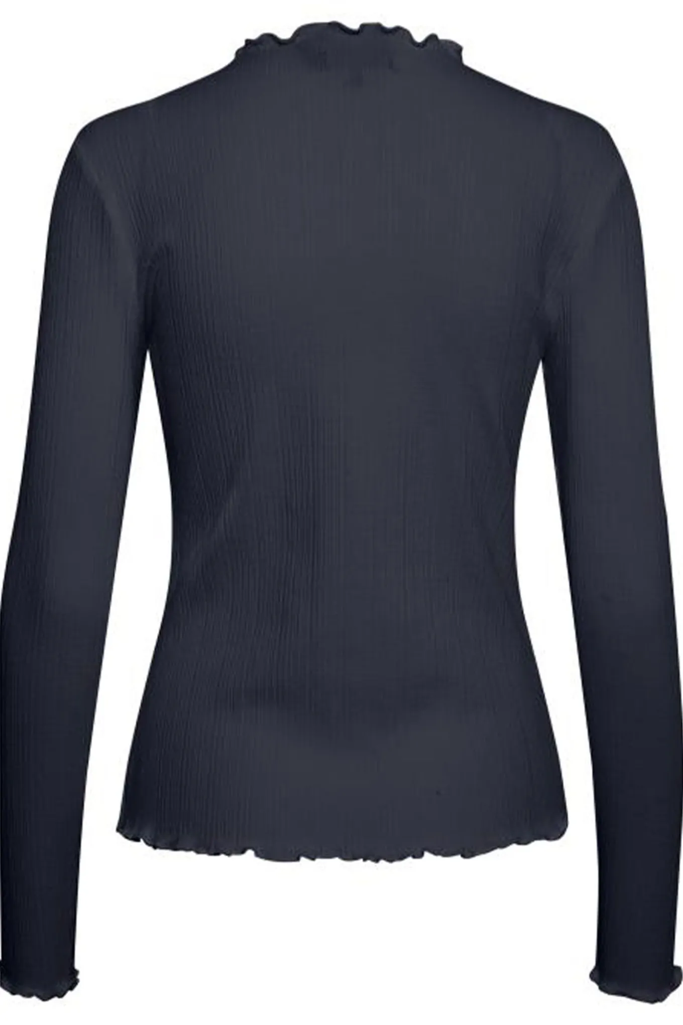Levering kan blive forlænget med 1-2 dage, hvis varen ikke findes i vores butik lige nu.Flot t-shirt fra Karen By Simonsen med lange ærmer og fine rynkekanter.