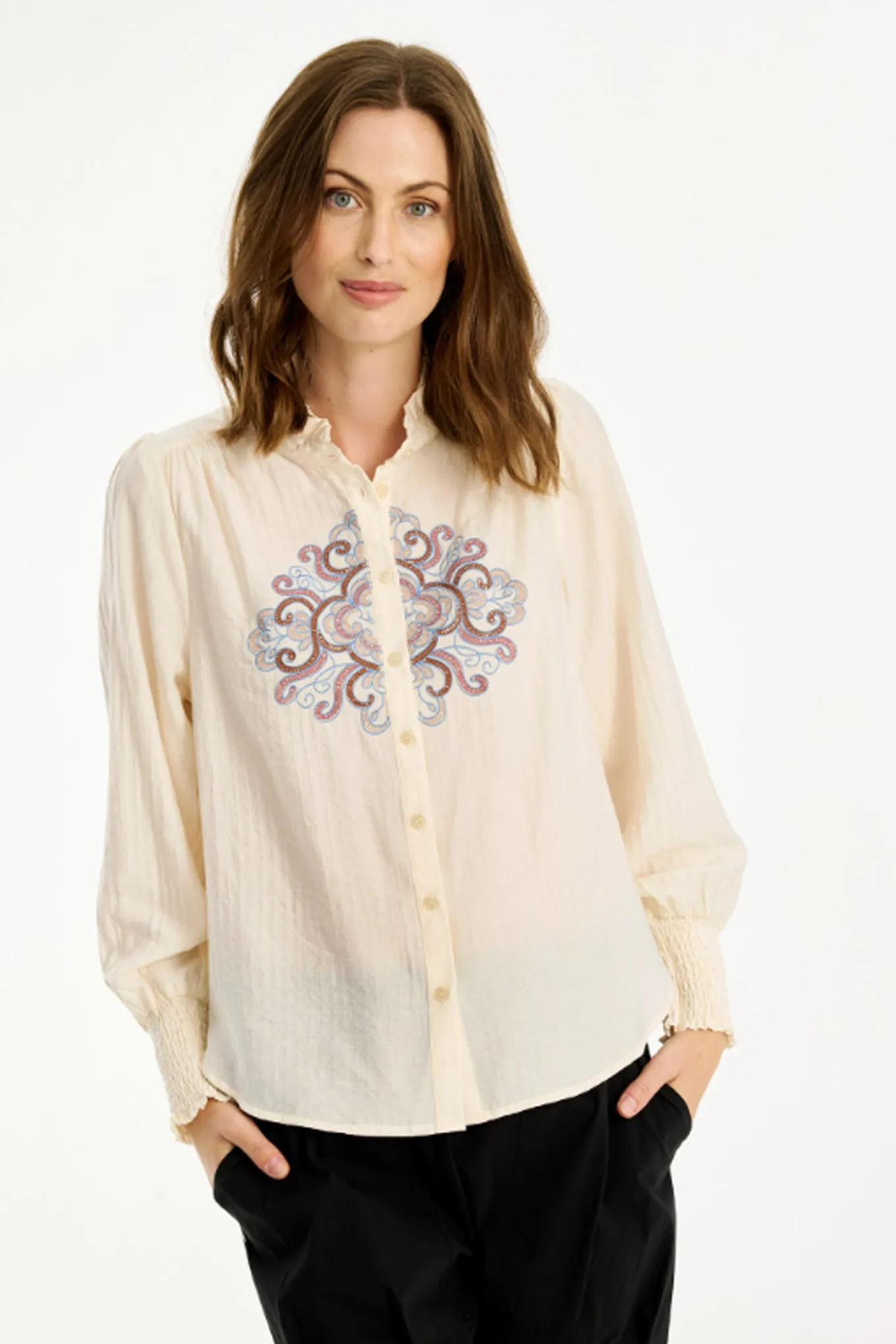 OBS! Fjernlager. Levering kan blive forlænget med 2-3 dage, hvis varen ikke findes i vores butik lige nu.Super fin skjorte fra In Front med lange pufærmer, tætsiddende smock manchetter og en lille krave i halsen.Skjorten har også små knapper langs fronten og smukt broderi på brystet.