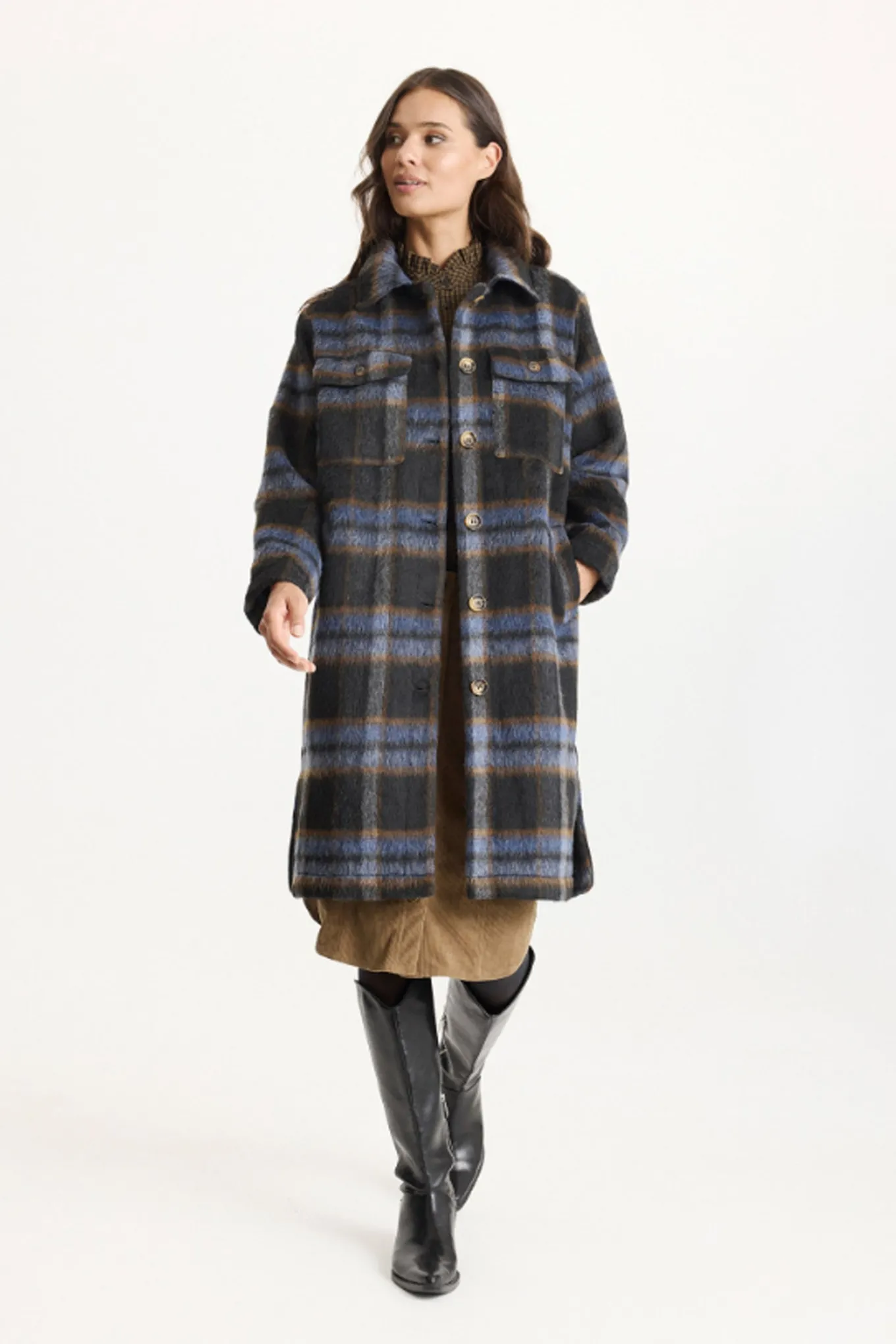 Flot ternet frakke fra In Front med lange ærmer, krave i halsen og store lommer på brystet. Frakken har også en dejlig blød kvalitet og et lige snit.