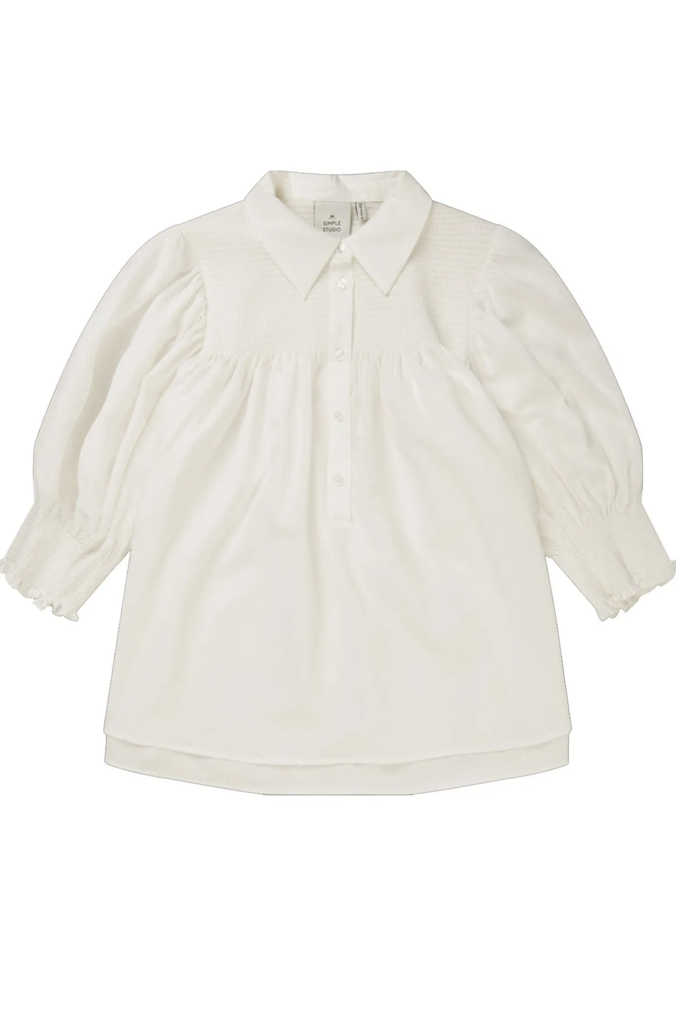Elegant top fra Munthe med ½ lange pufærmer, skjortekrave i halsen og knaplukning langs fronten.Toppen har også smock over brystet og en afslappet silhuet.