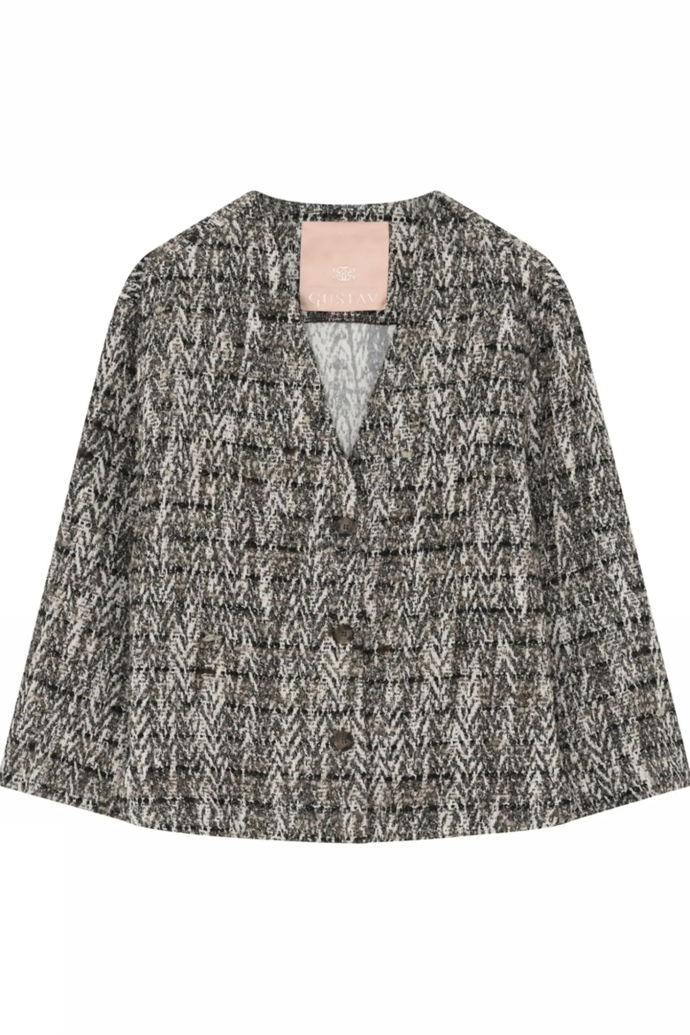 OBS! Fjernlager. Levering kan blive forlænget med 2-3 dage, hvis varen ikke findes i vores butik lige nu.Smuk jakke fra Gustav med lange ærmer, v-udskæring i halsen og store knapper langs fronten.Jakken har også en super flot vævet kvalitet og en løs silhuet.