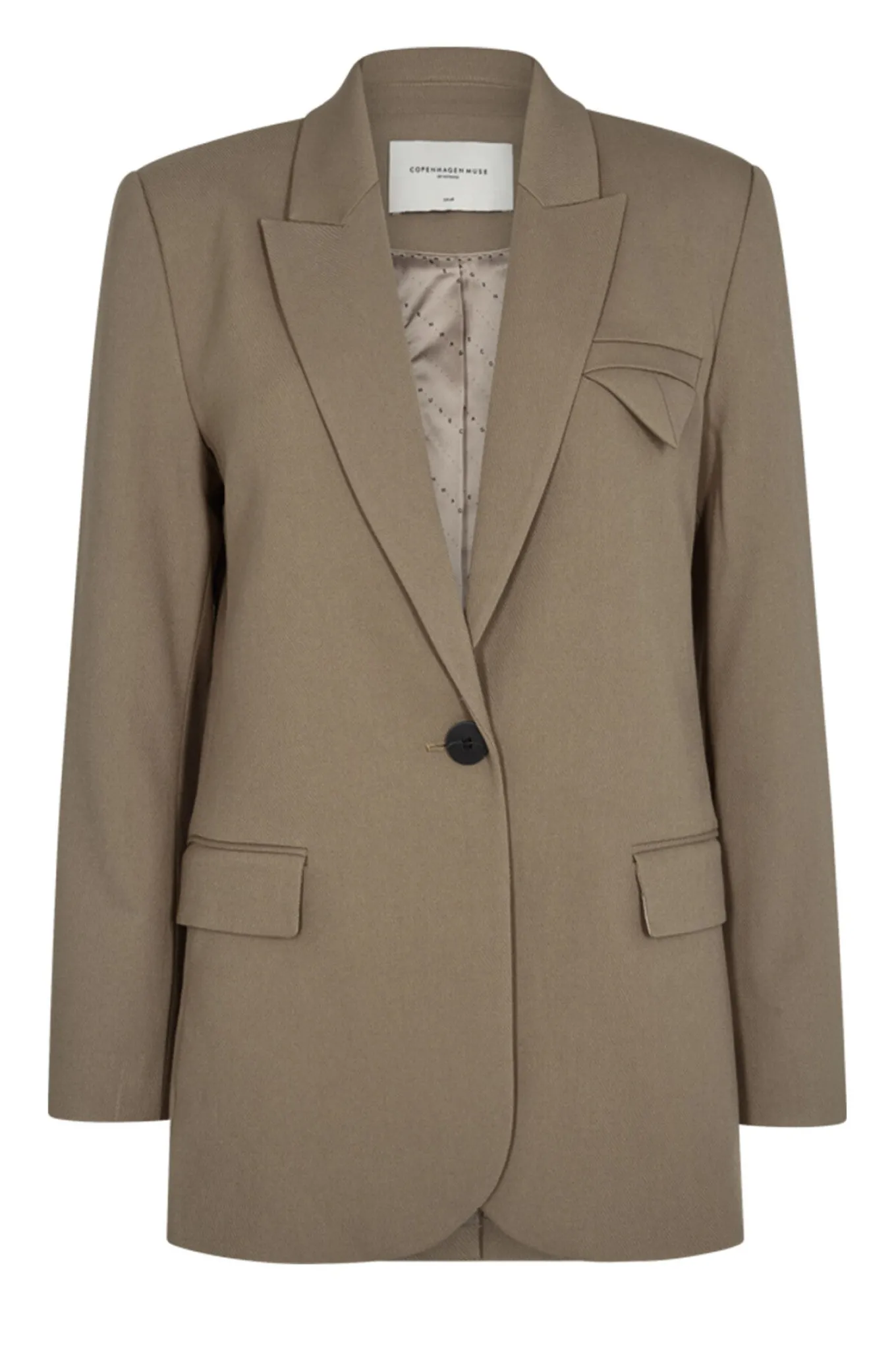 Flot og stilren blazer fra Copenhagen Muse med lange ærmer og en afslappet pasform. Blazeren har lommeflapper i fronten og lukkes også med en enkelt stor knap.
