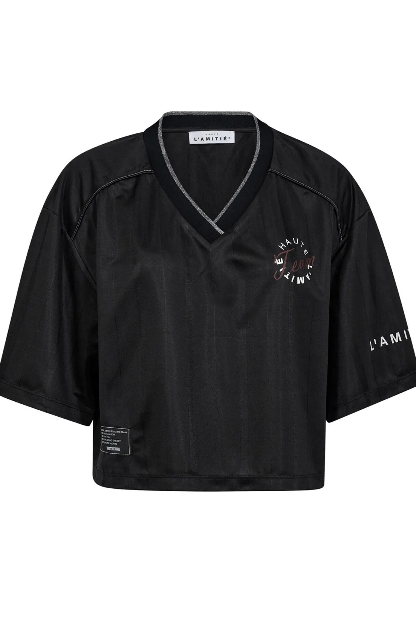 OBS! Fjernlager. Levering kan blive forlænget med 2-3 dage, hvis varen ikke findes i vores butik lige nu.Sporty tee fra Haute L’Amitié med korte ærmer, v-udskæring i halsen og en cropped længde.