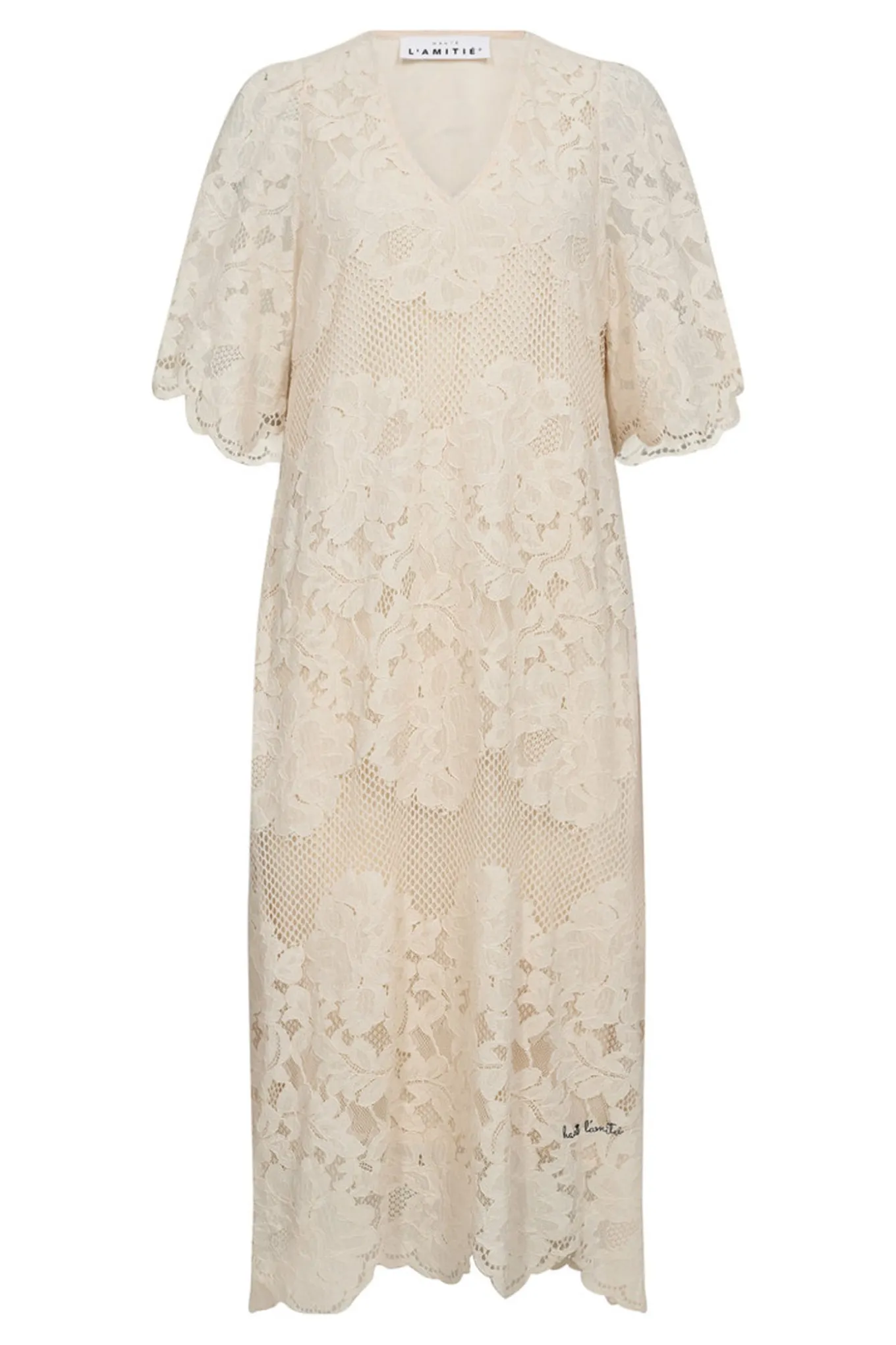 OBS! Fjernlager. Levering kan blive forlænget med 2-3 dage, hvis varen ikke findes i vores butik lige nu.Smuk blondekjole fra Haute L’Amitié med korte ærmer, v-udskæring i halsen og den flotteste broderet kvalitet der giver et feminint udtryk med et enkelt snit.
