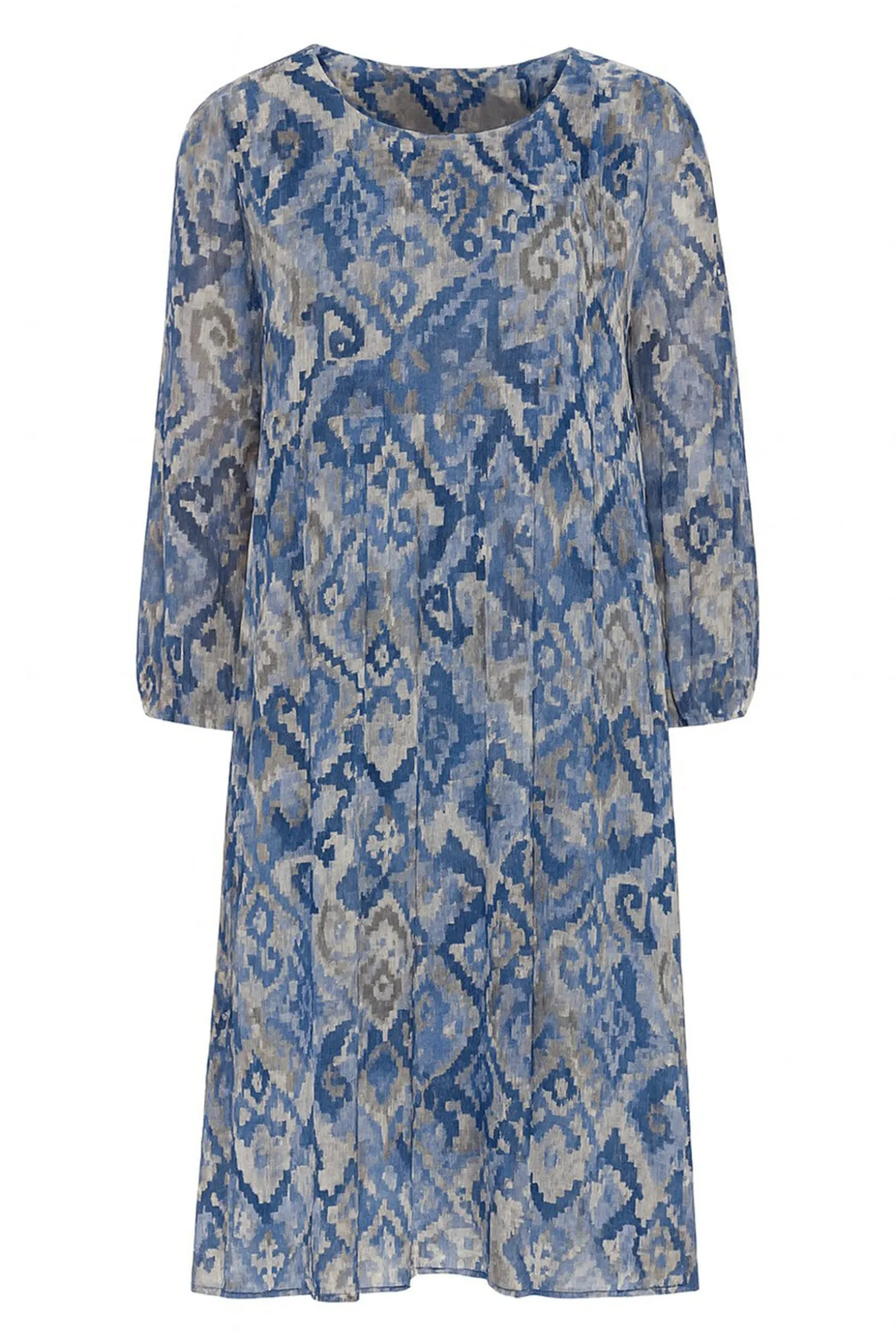 OBS! Fjernlager. Levering kan blive forlænget med 2-3 dage, hvis varen ikke findes i vores butik lige nu.Flot kjole fra 2-Biz med ¾ let puffede ærmer, rund hals og et smukt abstrakt print med en fin plisseret kvalitet.