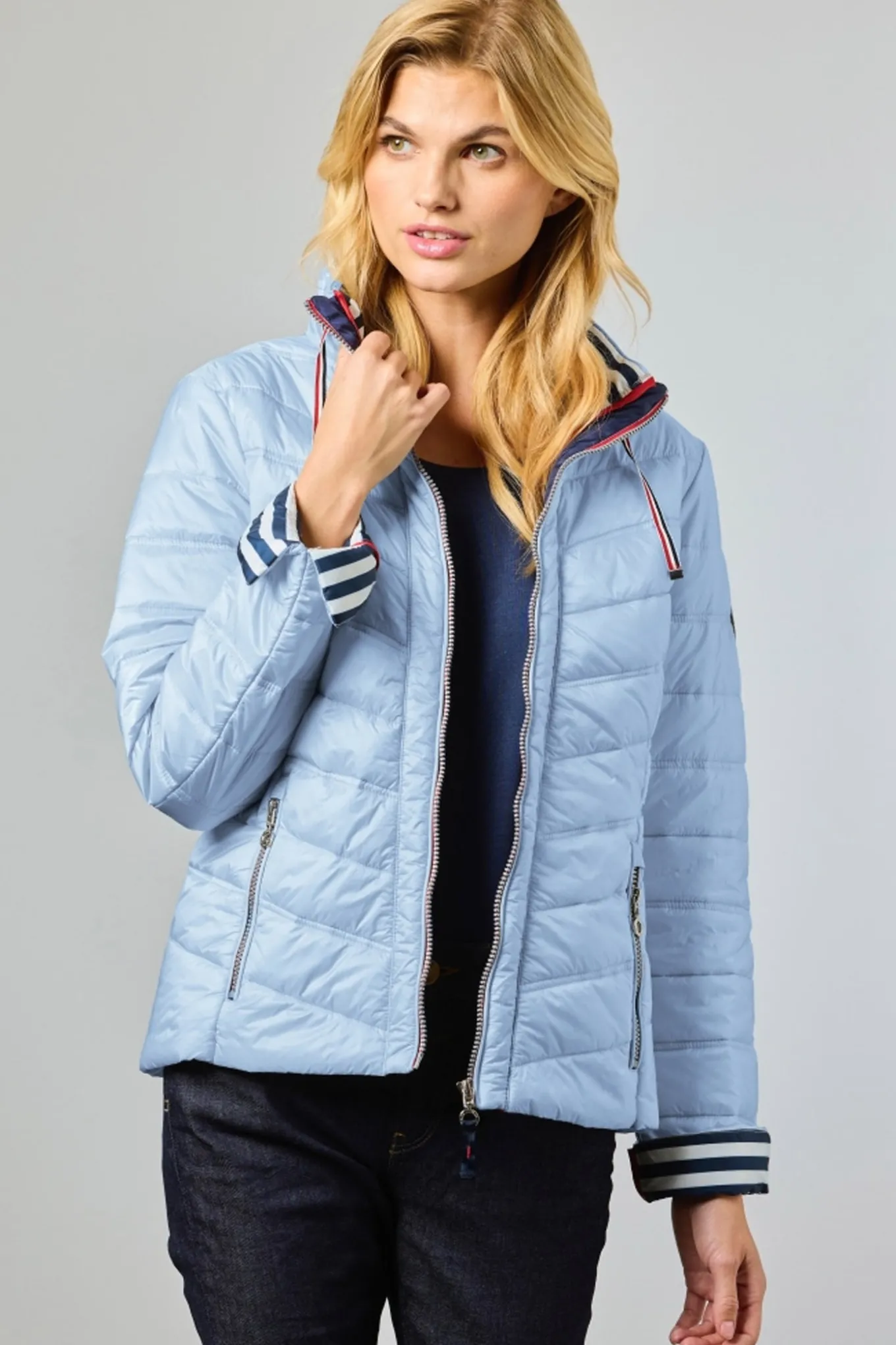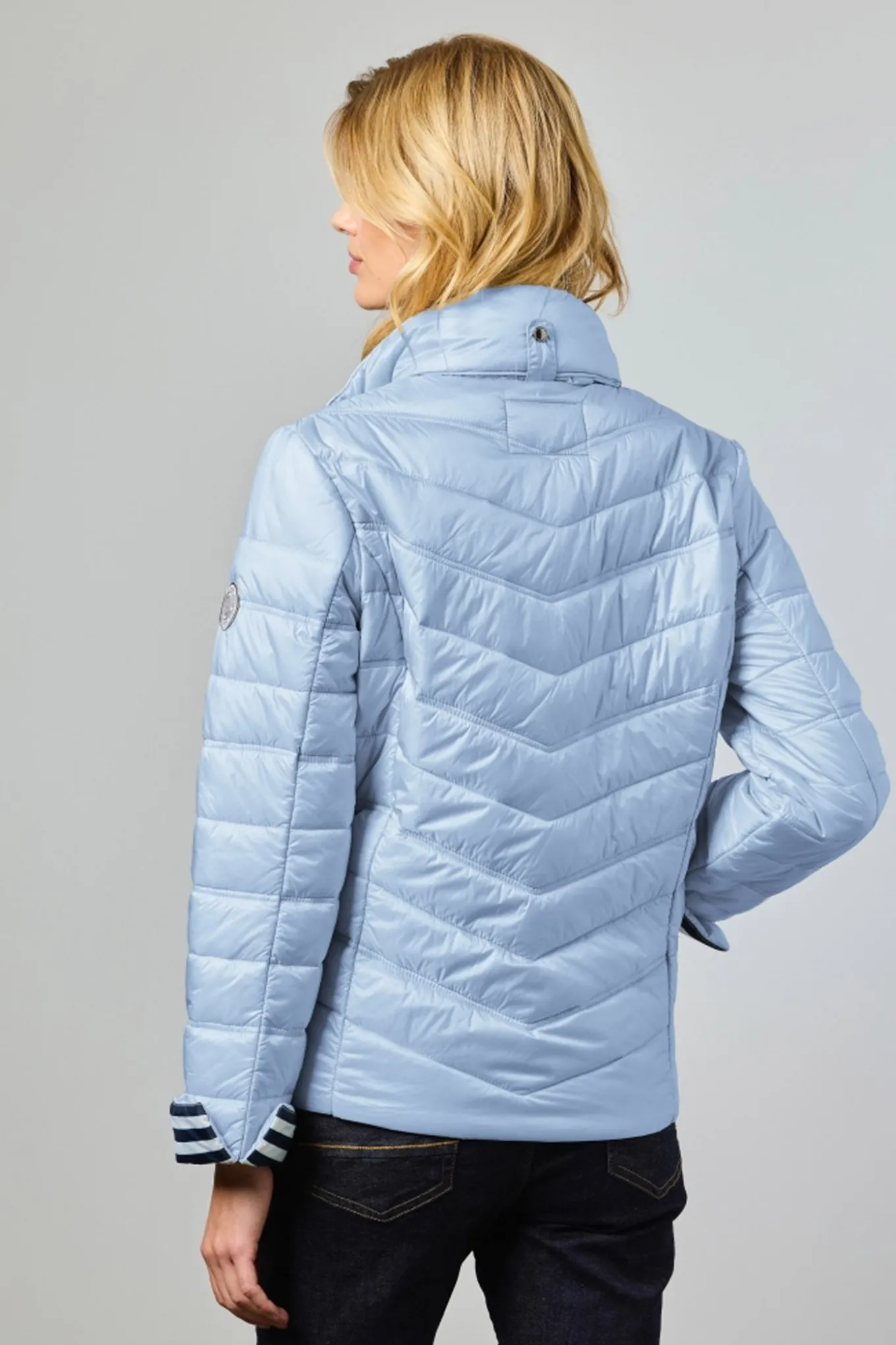 Udvalgte farver har en maritim-inspireret, stribet foring i kroppen, manchetterne og kraven for et friskt og sporty look. Farven 13–beige byder derimod på tone-i-tone foring med guld tilbehør for et mere elegant udtryk.