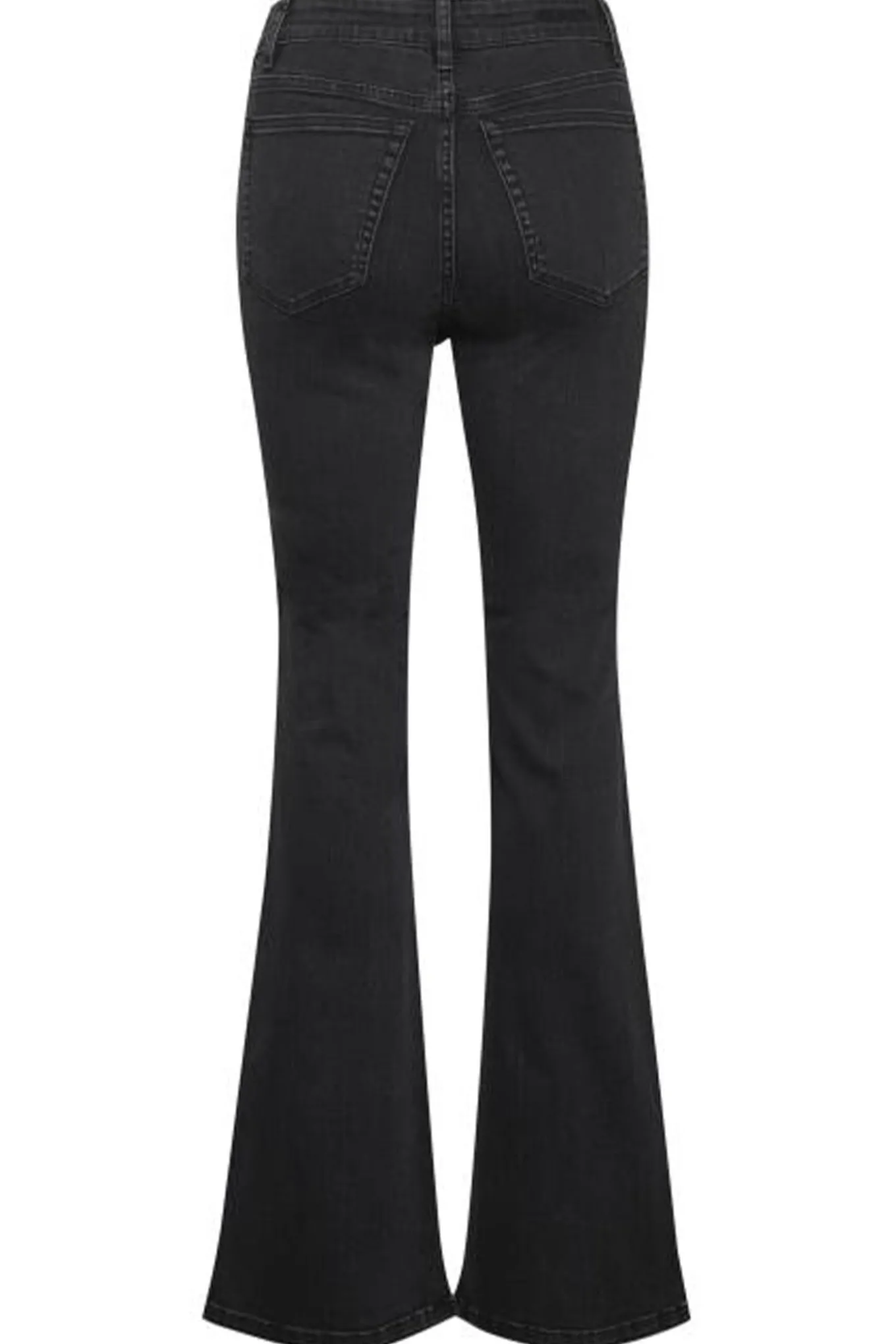 Bukserne har klassiske lommer og lukkes med knap og lynlås. - Pasform: Tætsiddende, high waist, flared leg.