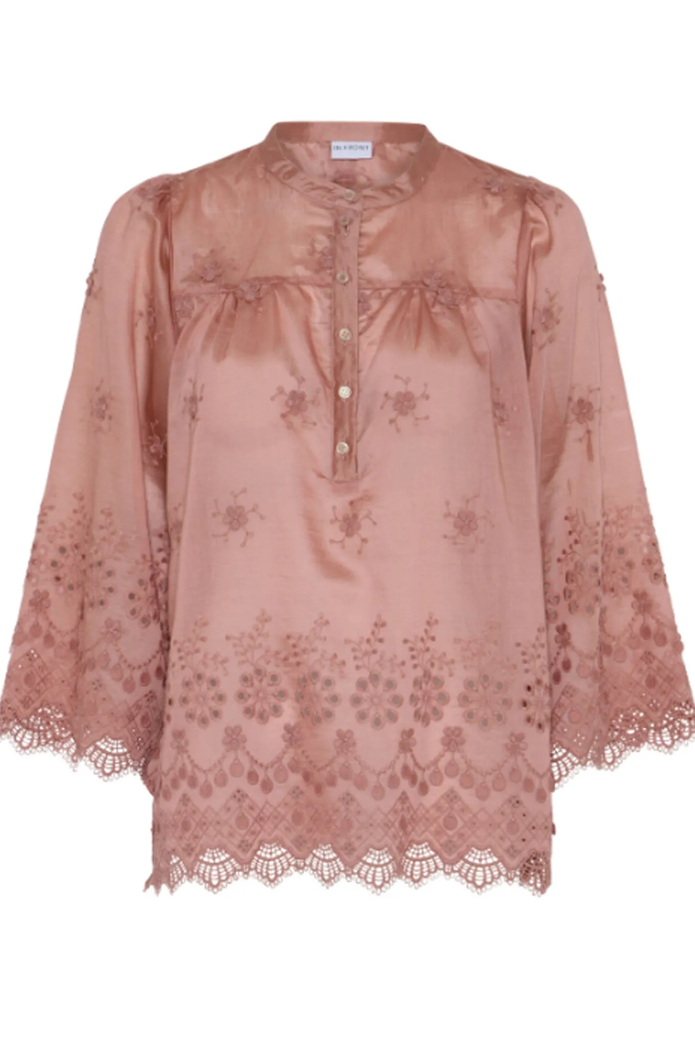OBS! Fjernlager. Levering kan blive forlænget med 2-3 dage, hvis varen ikke findes i vores butik lige nu.Smuk bluse fra In Front med ¾ lange ærmer, kinakrave i halsen og et kort knappanel over brystet.Blusen har også de smukkeste broderet blonde detaljer og en afslappet silhuet.