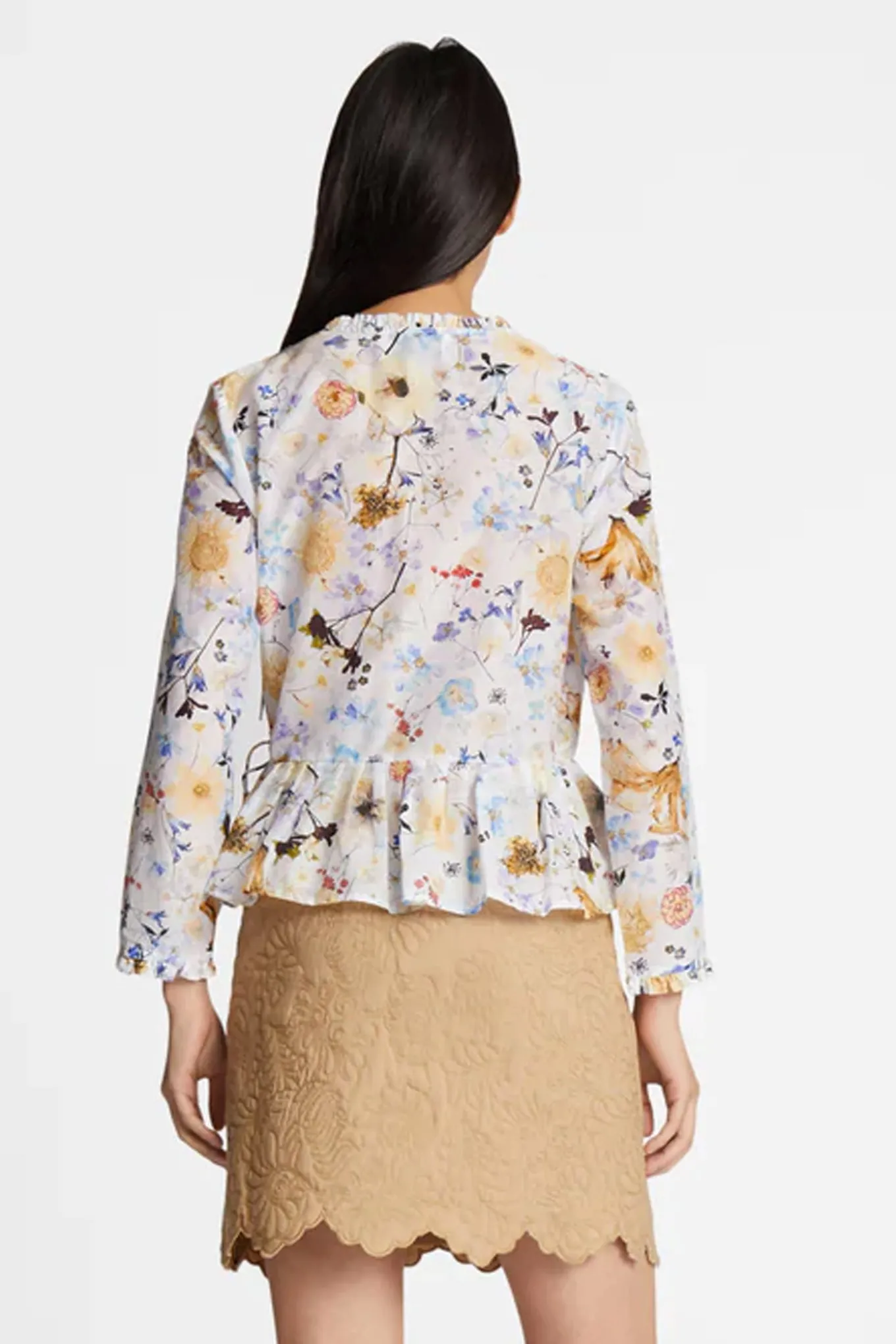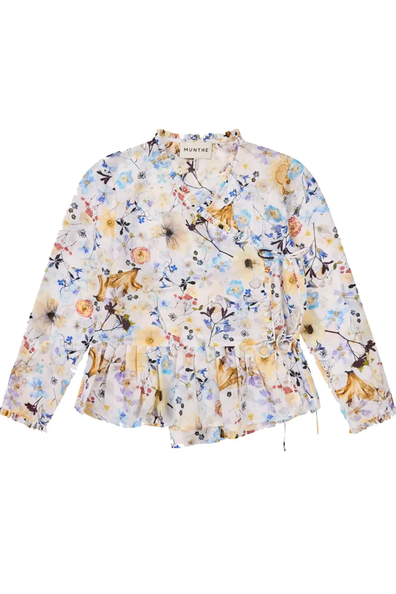 OBS! Fjernlager. Levering kan blive forlænget med 2-3 dage, hvis varen ikke findes i vores butik lige nu.En smuk slå om bluse fra Munthe, med et elegant print lavet af kronblade fra blomster Naja Munthe har plantet i sin egen have. Blusen har en smuk peplum bund, detaljerede kanter, samt en elegant snorelukning. Blusen er designet i en blød silkeblanding.