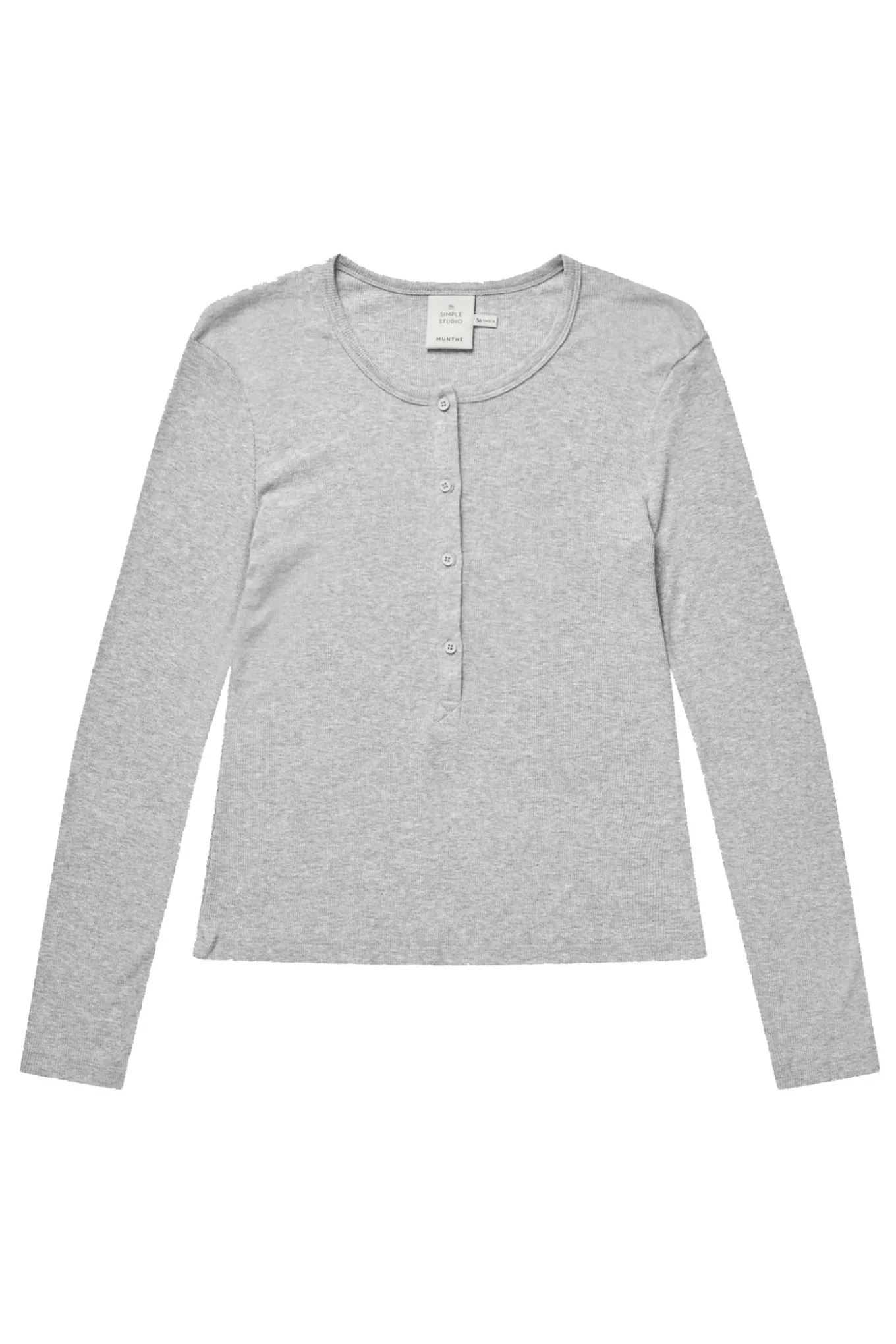 En ribbet T-shirt med en elegant delvis knaplukning på brystet. T-shirten har lange ærmer og er designet med en rund halsudskæring.