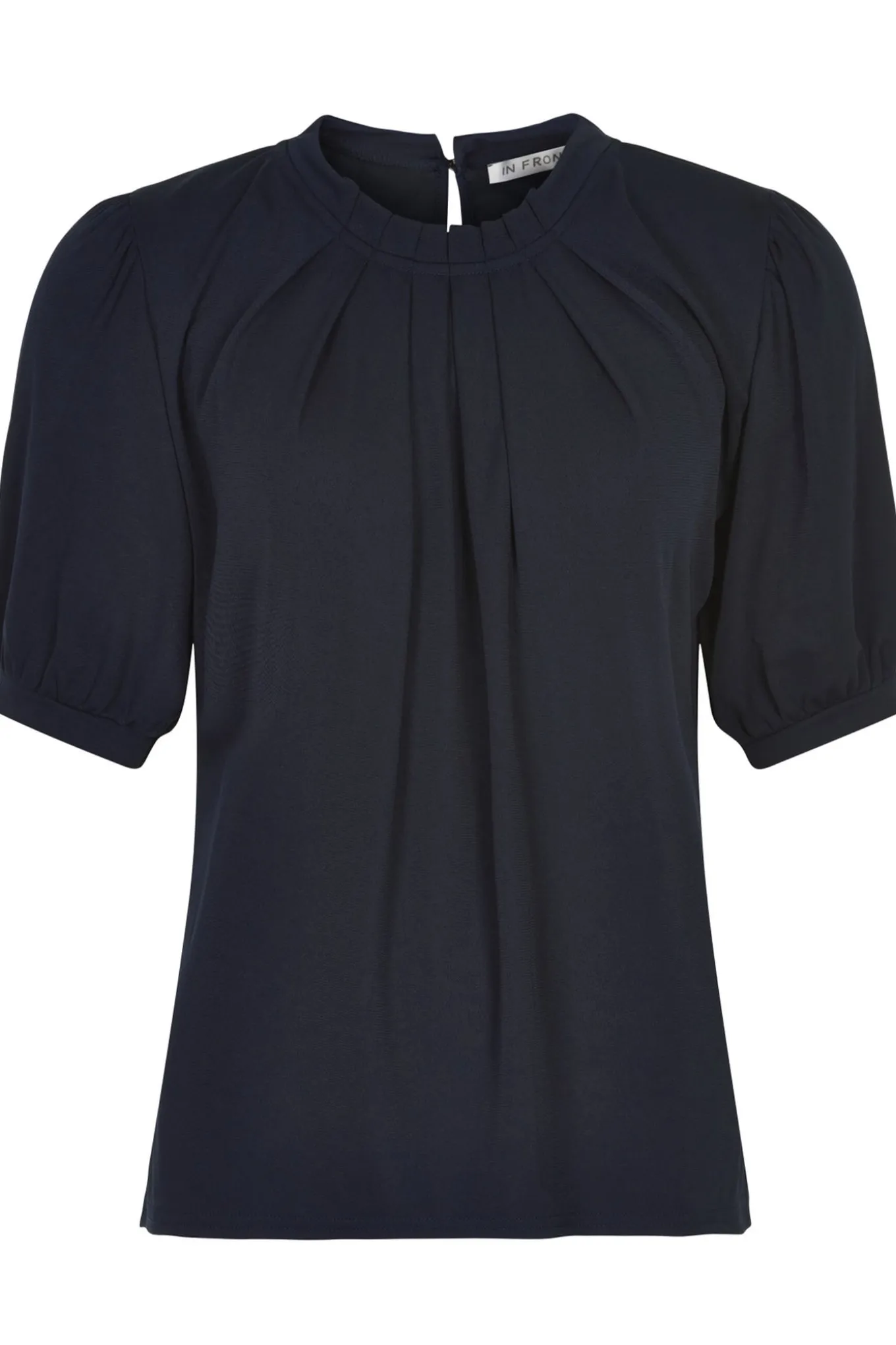 Levering kan blive forlænget med 1-2 dage, hvis varen ikke findes i vores butik lige nu.Sød og feminin bluse fra In Front med ½ lange ærmer og høj hals med en fin lille flæsekant.