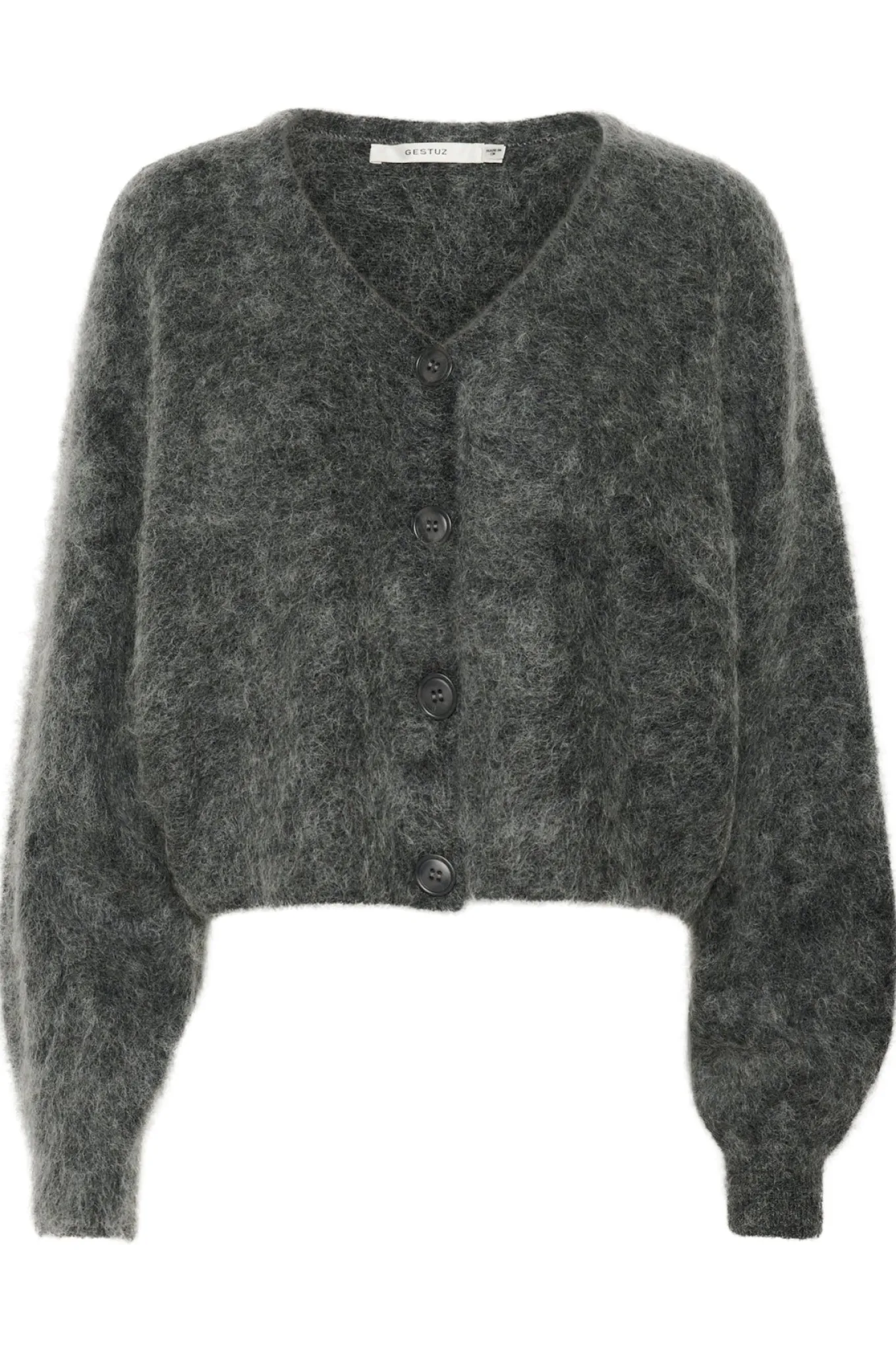 OBS! Fjernlager. Levering kan blive forlænget med 2-3 dage, hvis varen ikke findes i vores butik lige nu.Blød og lækker cardigan fra Gestuz med lange pufærmer. v-udskæring i halsen og små knapper langs fronten.