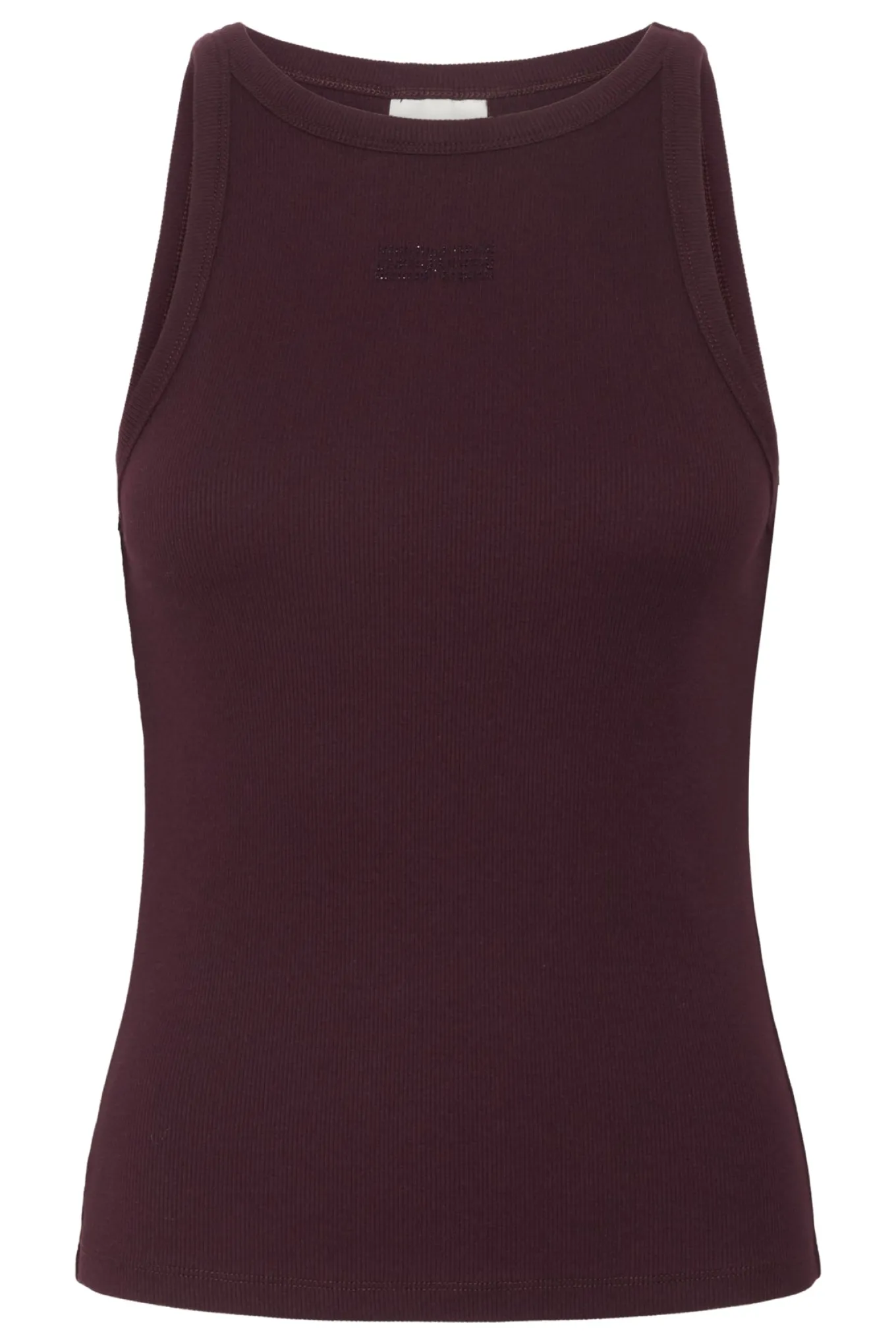 OBS! Fjernlager. Levering kan blive forlænget med 2-3 dage, hvis varen ikke findes i vores butik lige nu.Smart ribbet tank top fra Gestuz med rund hals og et fint lille logo over brystet.