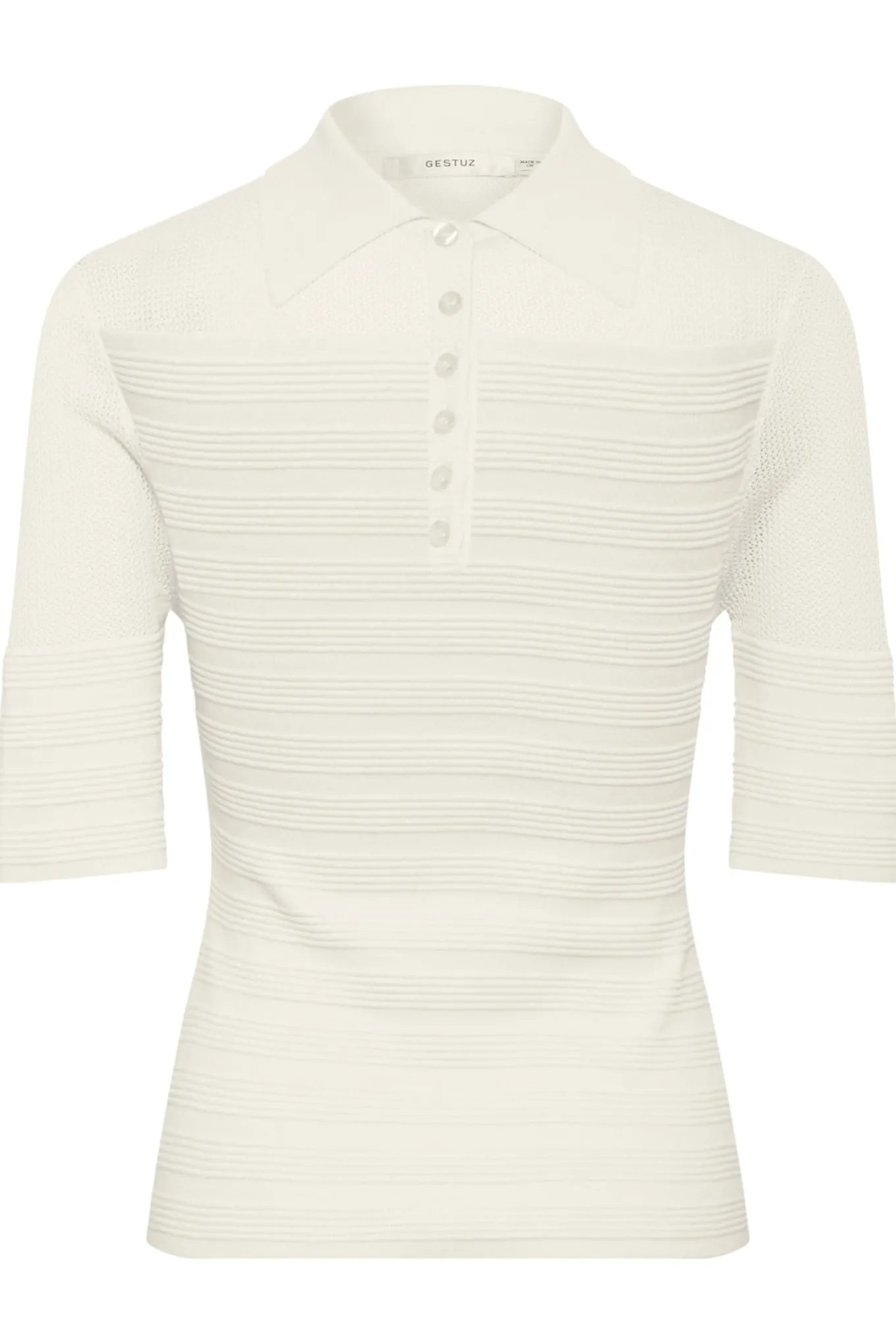 OBS! Fjernlager. Levering kan blive forlænget med 2-3 dage, hvis varen ikke findes i vores butik lige nu.Flot top fra Gestuz med korte ærmer, en blød krave i halsen og et kort knappanel over brystet.