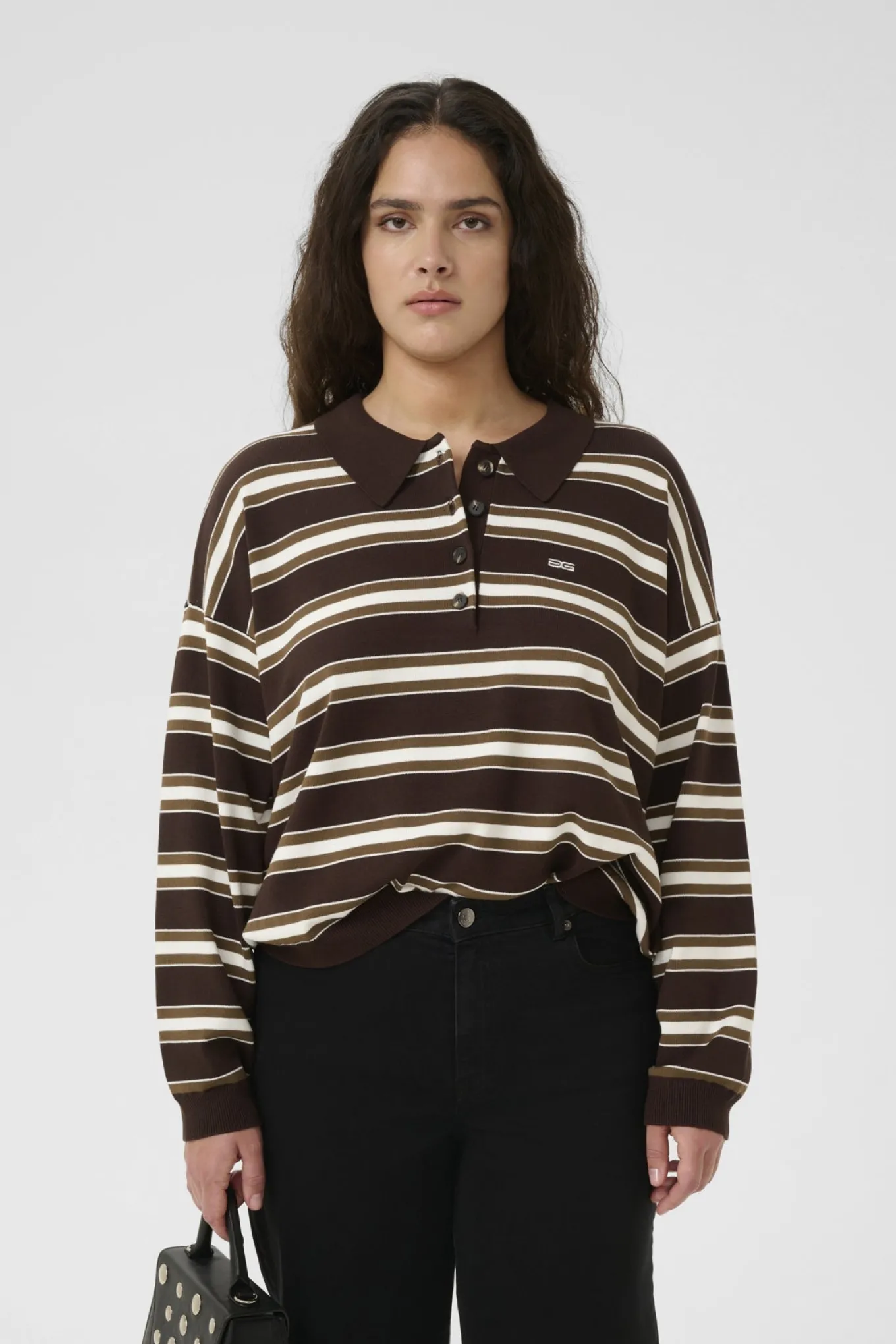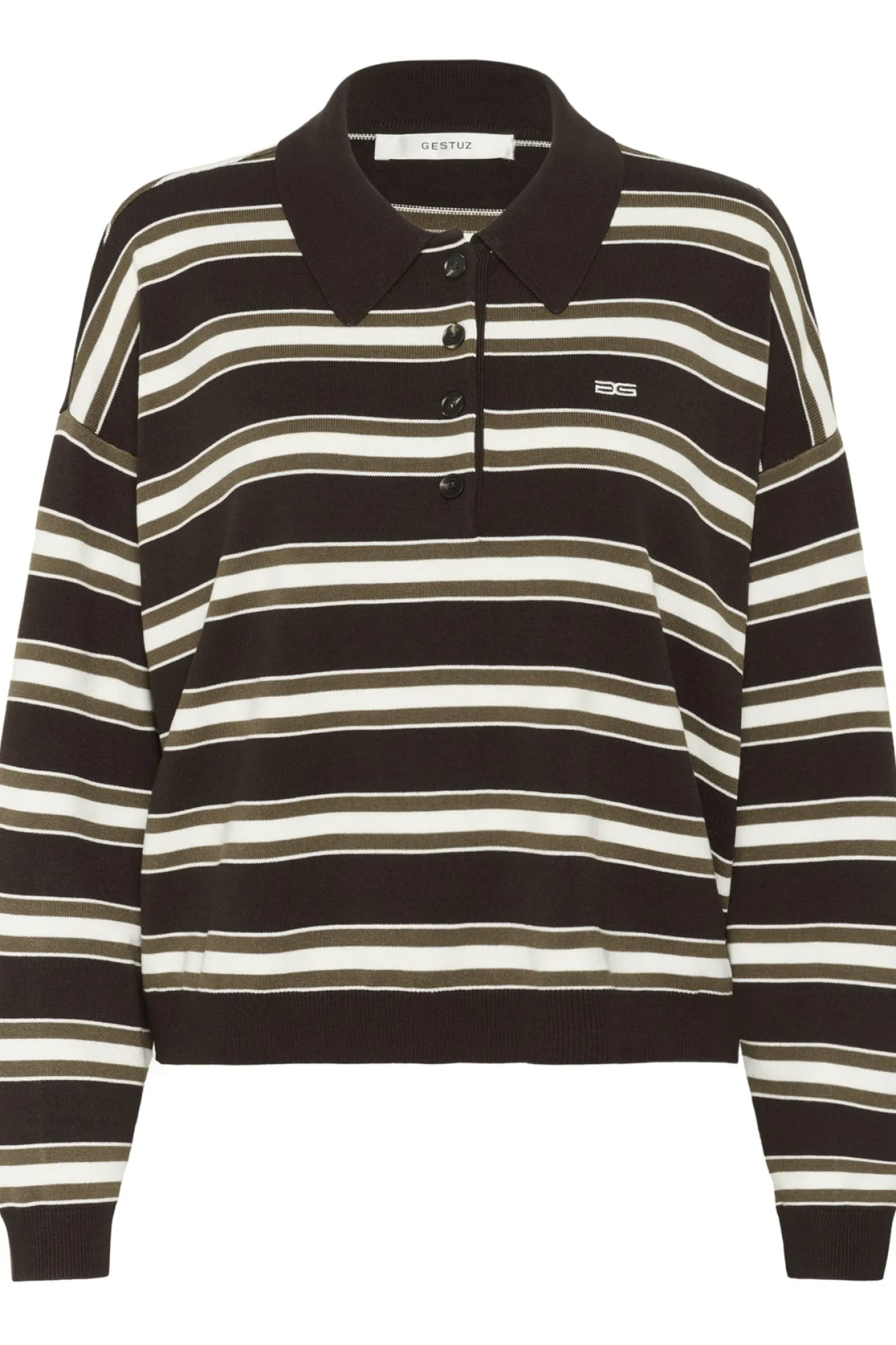 OBS! Fjernlager. Levering kan blive forlænget med 2-3 dage, hvis varen ikke findes i vores butik lige nu.Smart polo strik fra Gestuz med lange ærmer, en lille krave i halsen og et kort knappanel over brystet.Strikken har også et fint stribet mønster og et lille broderet logo på brystet.