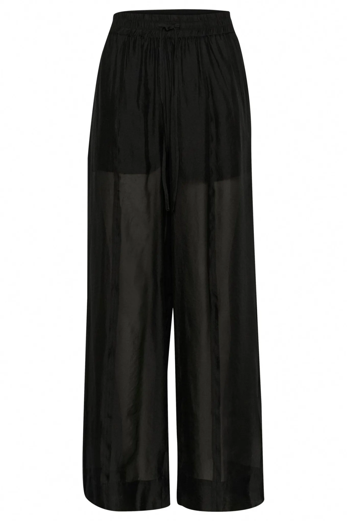 OBS! Fjernlager. Levering kan blive forlænget med 2-3 dage, hvis varen ikke findes i vores butik lige nu.Super flotte bukser fra Gestuz med en bred elastikkant i taljen, vidde i benene og en let transparent kvalitet.