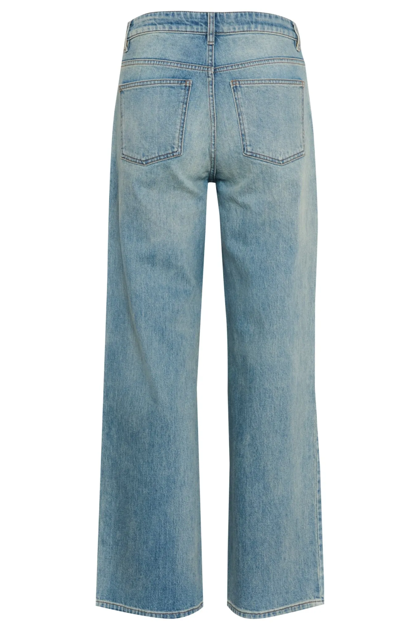 OBS! Fjernlager. Levering kan blive forlænget med 2-3 dage, hvis varen ikke findes i vores butik lige nu.Super smarte jeans fra Gestuz med vidde i benene, et straight-leg snit og de skønneste similisten omkring forlommerne.